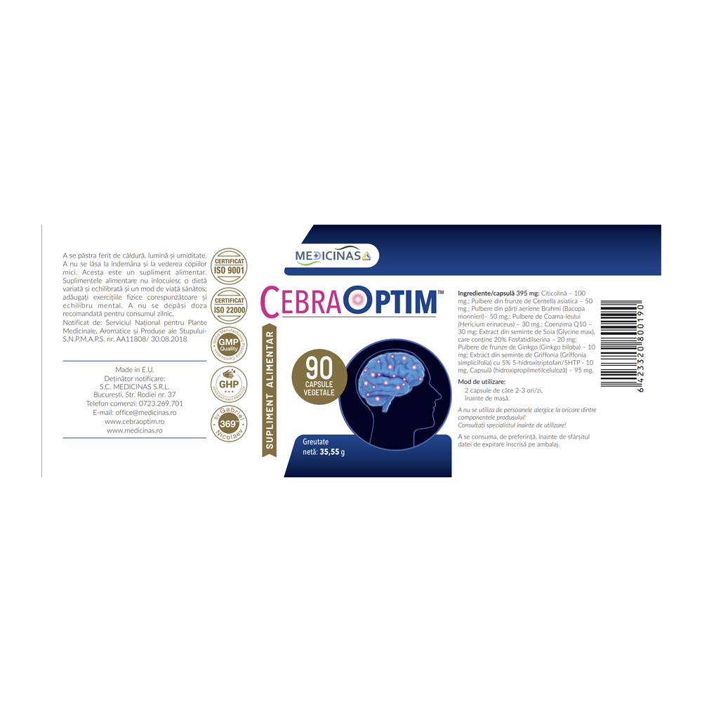 Ingrediente:Ingrediente/capsula 395 mg: Citicolina - 100 mg; Pulbere din frunze de Centella asiatica - 50 mg; Pulbere din parti aeriene Brahmi (Bacopa monnieri) - 50 mg; Pulbere de Coama-leului (Hericium erinaceus) - 30 mg; Coenzima Q10 - 30 mg; Extract din seminte de Soia (Glycine max), care contine 20% Fosfatidilserina - 20 mg; Pulbere de frunze de Ginkgo (Ginkgo biloba) - 10 mg; Extract din seminte de Griffonia (Griffonia simplicifolia) cu 5% 5-hidroxitriptofan/5HTP - 10 mg. Capsula (hidroxipropilmetilceluloza) - 95 mg.