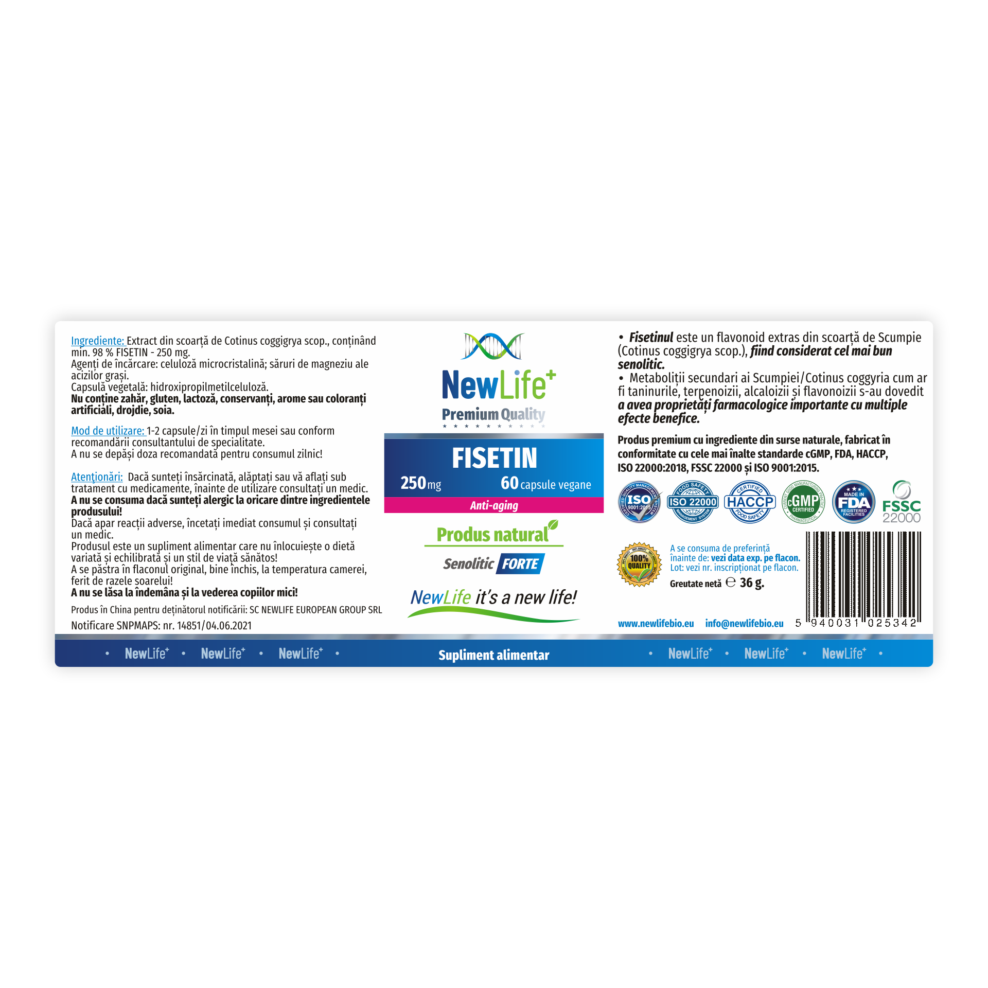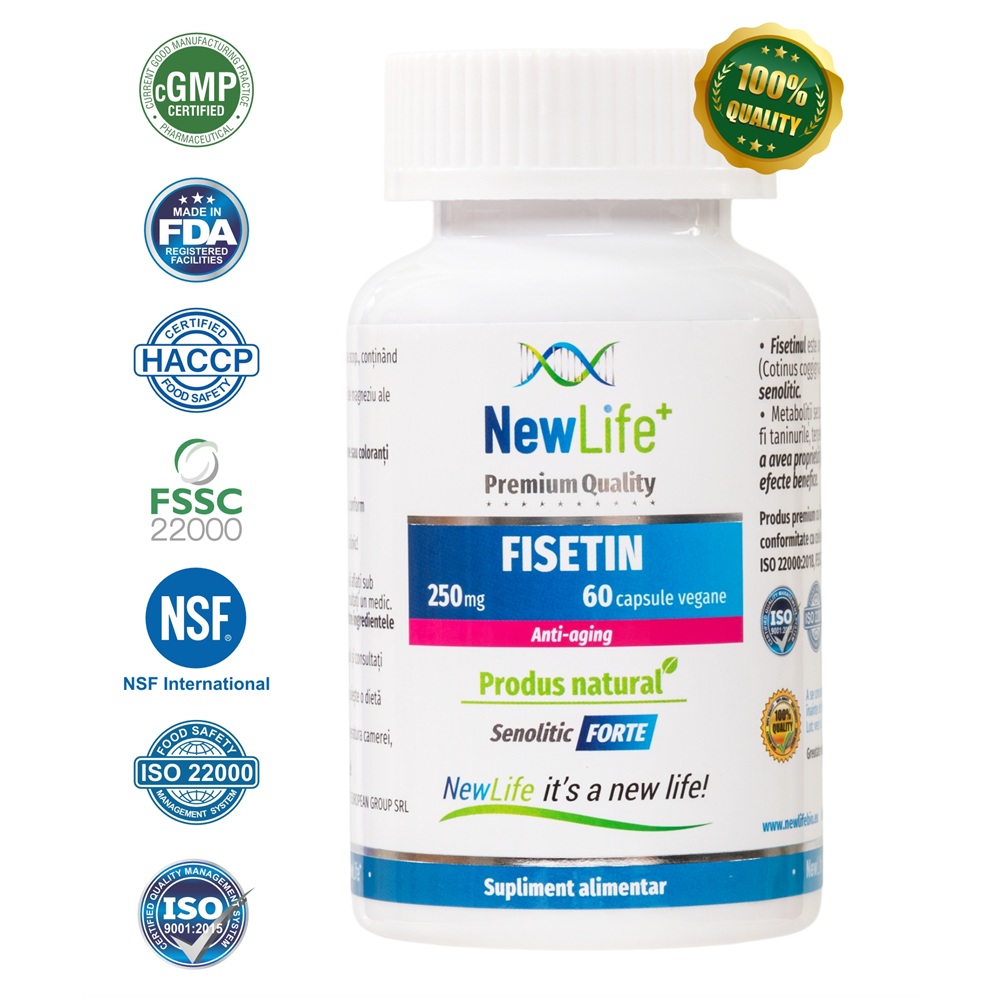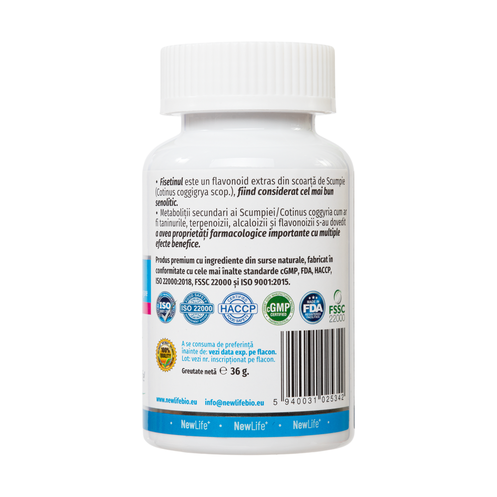 Ingrediente:- FISETIN - 250 mg - Extract din scoarță de Cotinus coggyria scop., conținând min. 98 % fisetin;