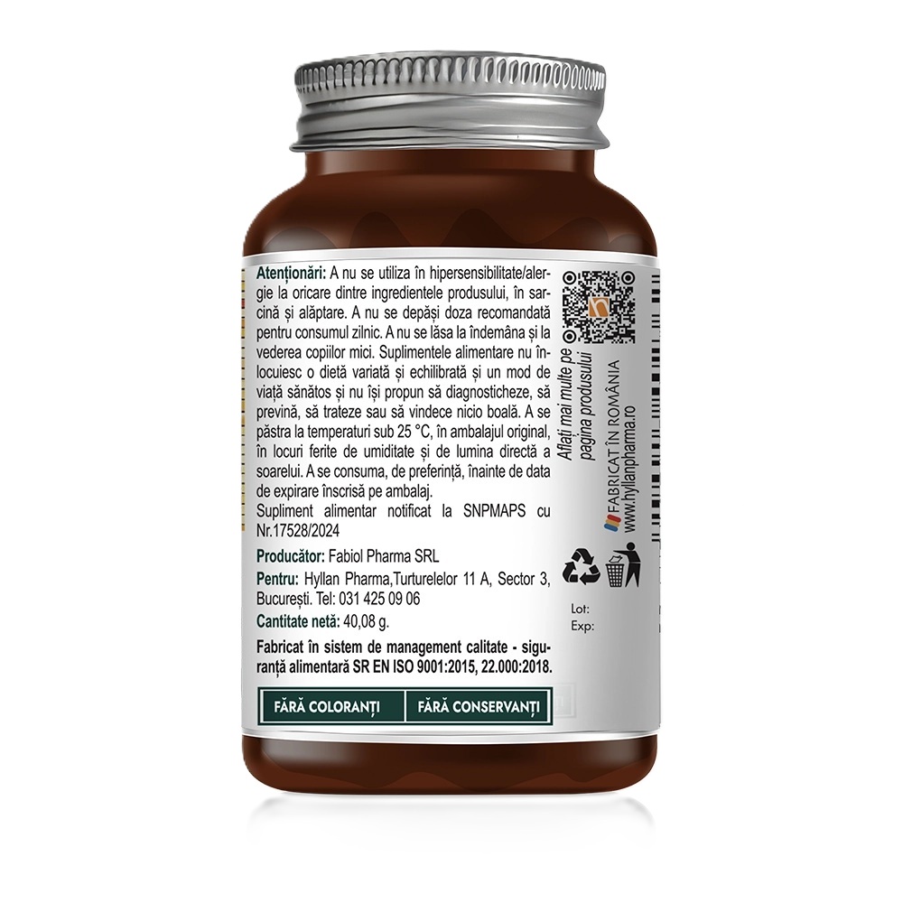 Precautii:A nu se utiliza in hipersensibilitate/alergie la oricare dintre ingredientele produsului, in sarcina si alaptare. A nu se depasi doza recomandata pentru consumul zilnic. A nu se lasa la indemana si la vederea copiilor mici. Suplimentele alimentare nu inlocuiesc o dieta variata si echilibrata si un mod de viata sanatos si nu isi propun sa diagnosticheze, sa previna, sa trateze sau sa vindece nicio boala. A se pastra la temperaturi sub 25 °C, in ambalajul original, in locuri ferite de umiditate si de lumina directa a soarelui. A se consuma, de preferinta, inainte de data de expirare inscrisa pe ambalaj.