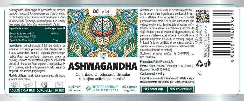 Extract etanolic 5-8:1 din radacini de Withania somnifera (Ashwagandha) standardizat in 7-10% withanolide, capsula vegetala (hidroxipropilmetilceluloza, apa purificata, caragenan, acetat de potasiu), celuloza microcristalina (agent de incarcare), extract din fructe de Piper nigrum L. standardizat in 95% piperina, agenti antiaglomeranti: talc, saruri de magneziu ale acizilor grasi vegetali.