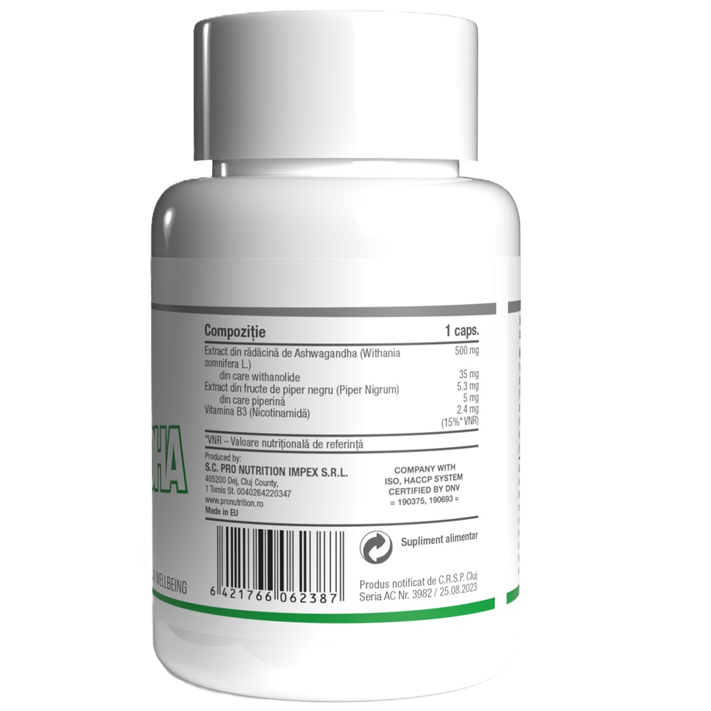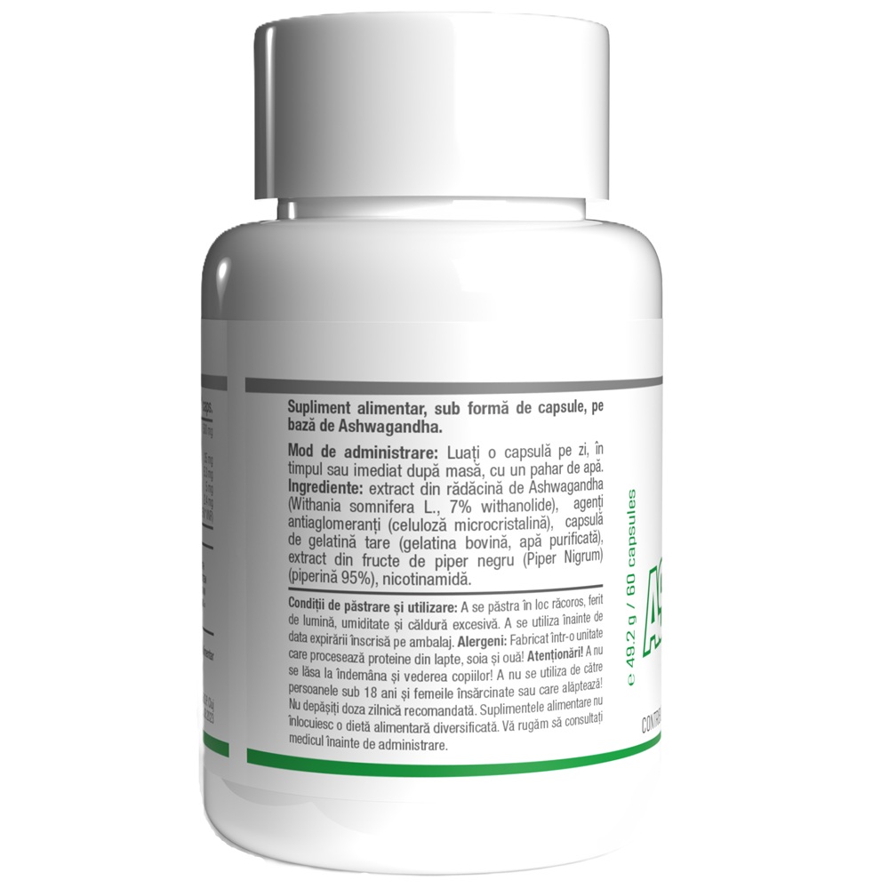 Extract din radacina de ashwagandha (Withania somnifera L., 7% withanolide), agenti antiaglomeranti (celuloza microcristalina), capsula de gelatina tare (gelatina bovina, apa purificata), extract din fructe de piper negru (Piper nigrum) (piperina 95%), nicotinamida.