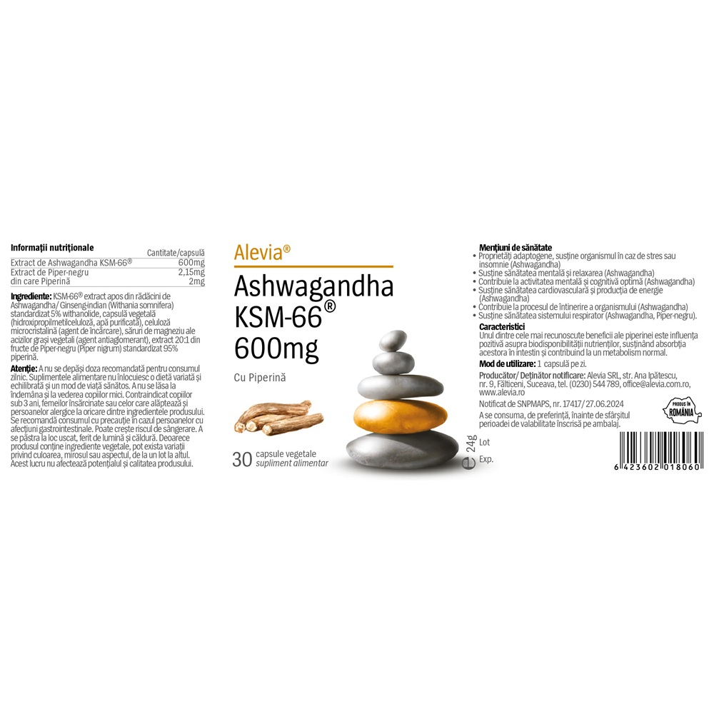 Ashwagandha KSM-66, 600 mg, 30 capsule vegetale, Alevia [6423602018060]
