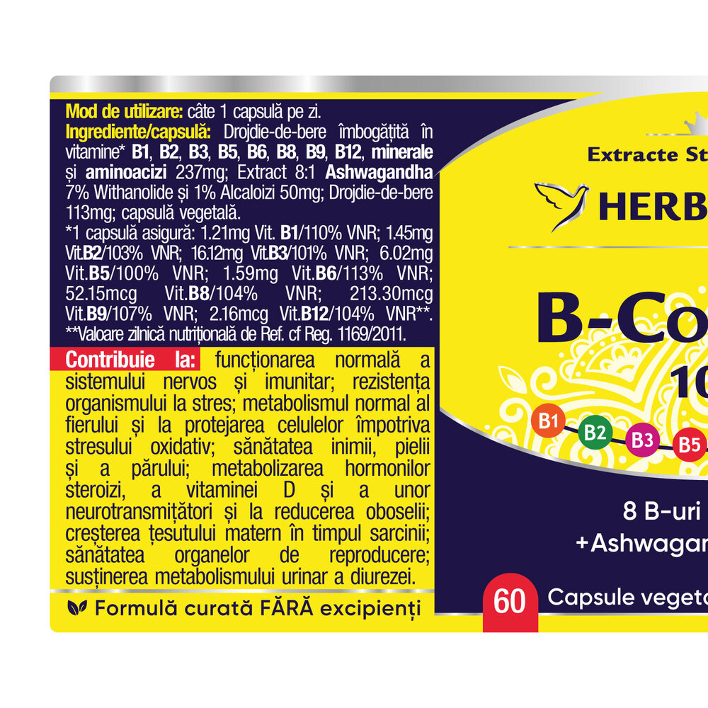 Drojdie-de-bere imbogatita in vitamine B1, B2, B3, B5, B6, B8, B9, B12, minerale si aminoacizi 237 mg; Extract 8:1 Ashwagandha 7% Withanolide si 1% Alcaloizi 50 mg; Drojdie-de-bere 113 mg; capsula: vegetala.