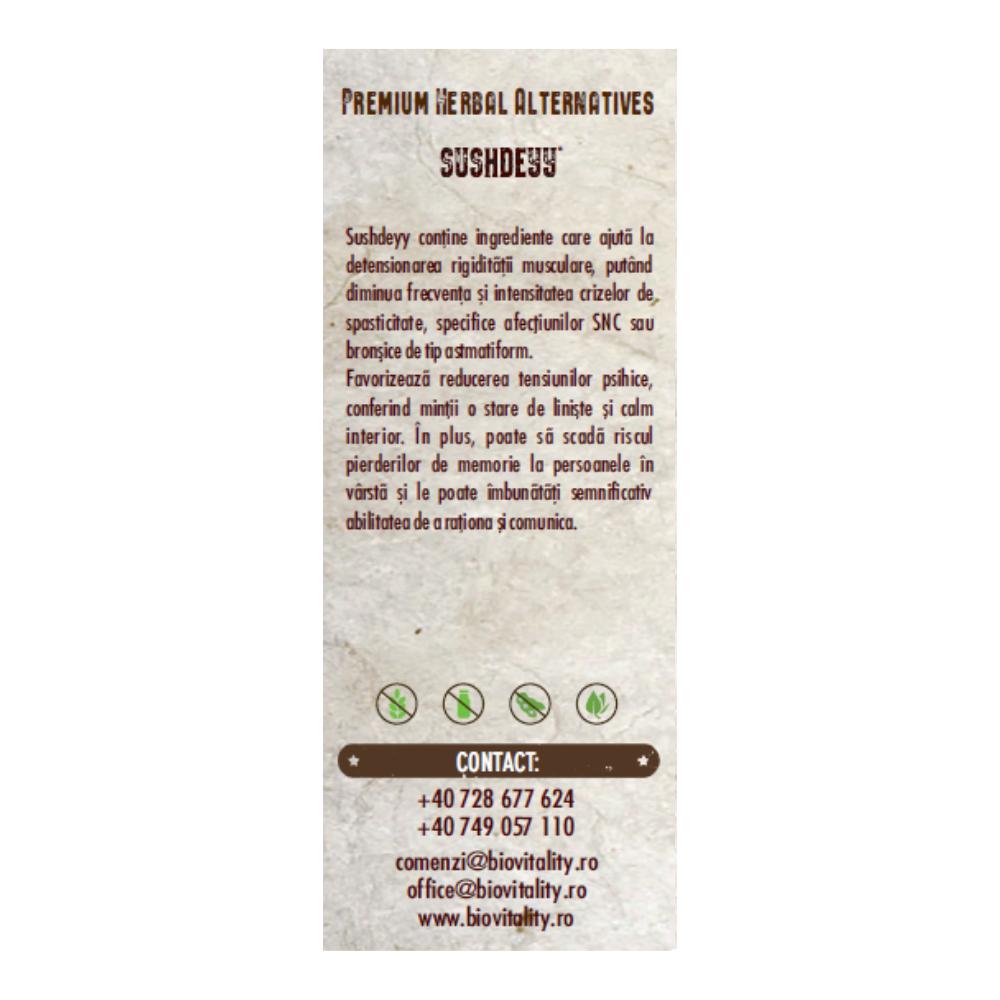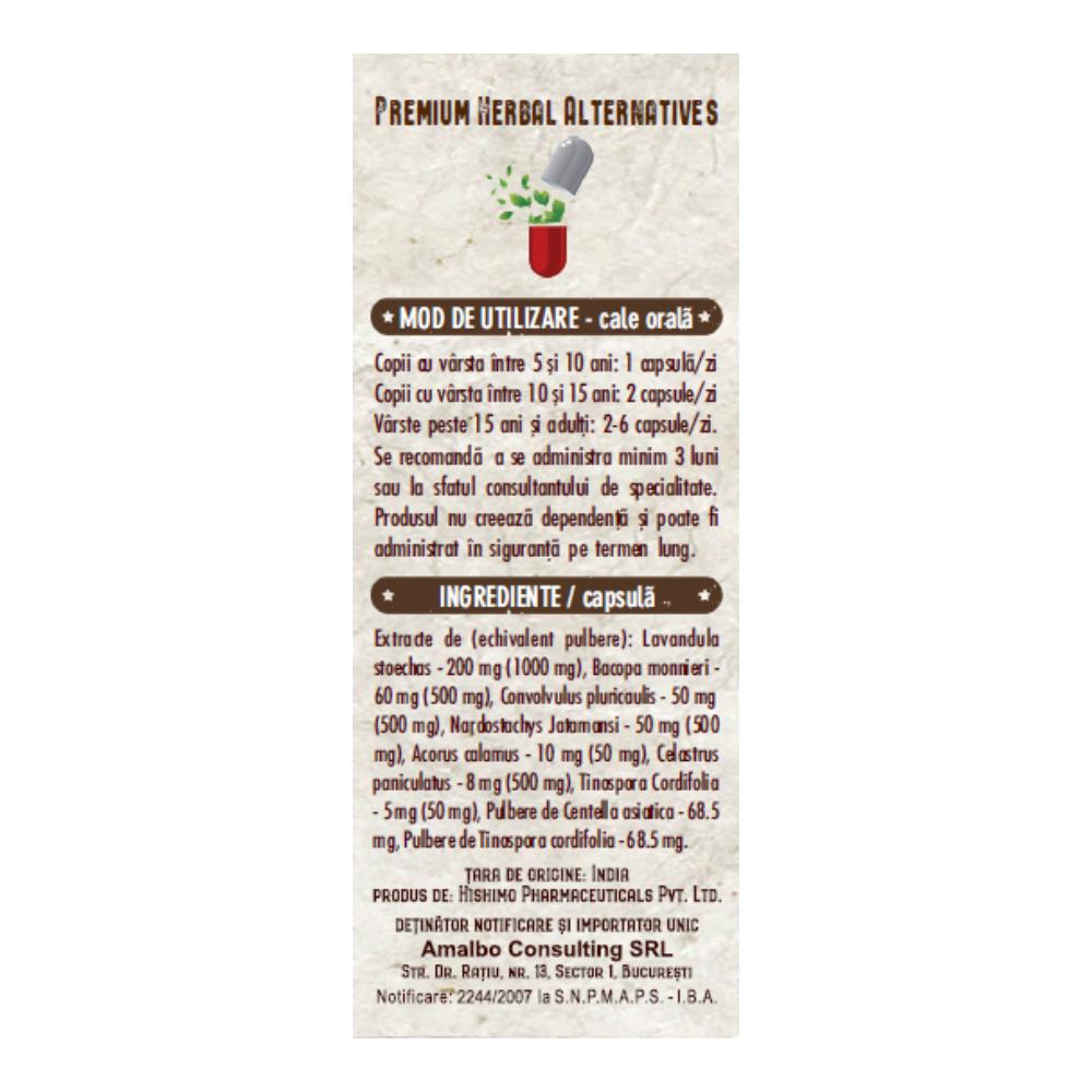 Extracte (echivalent pulbere): Lavandula stoechas 200 mg (1000 mg), Bacopa monnieri 60 mg (500 mg), Convolvulus pluricaulis 50 mg (500 mg), Nardostachys jatamansi 50 mg (500 mg), Acorus calamus 10 mg (50 mg), Celastrus paniculatus 8 mg (500 mg), Tinospora cordifolia 5 mg (50 mg), pulbere de Centella asiatica 68,5 mg, pulbere de Tinospora cordifolia 68,5 mg.