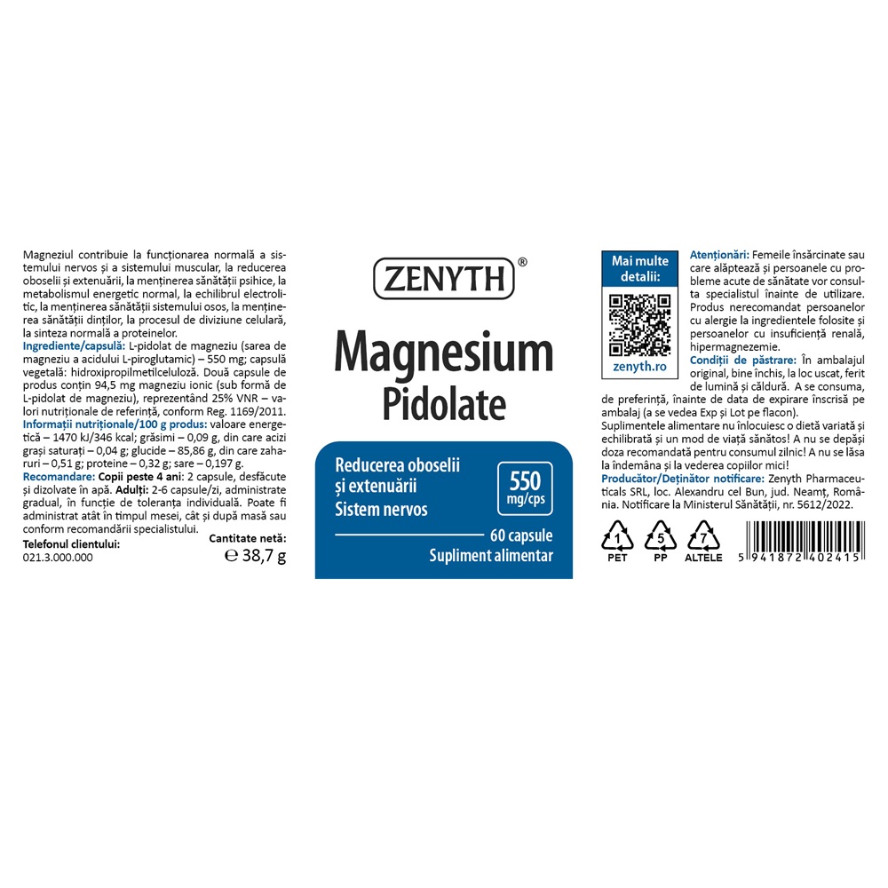 - Pidolatul de magneziu este o forma de magneziu obtinuta prin asocierea magneziului cu acidul pidolic, o molecula fiziologica, prezenta in mod natural in majoritatea tesuturilor corpului si in multe plante, poate avea rol de transportor pentru anumite substante care trebuie livrate organismului;