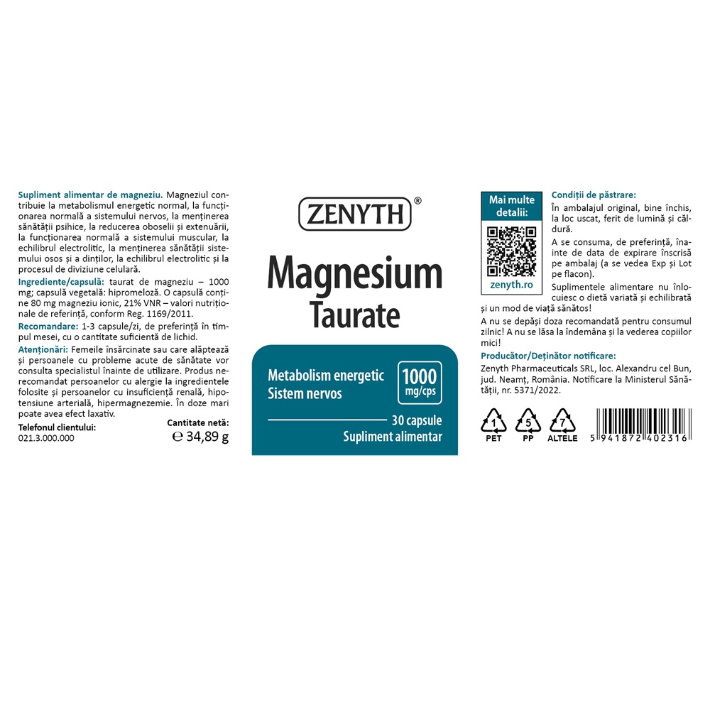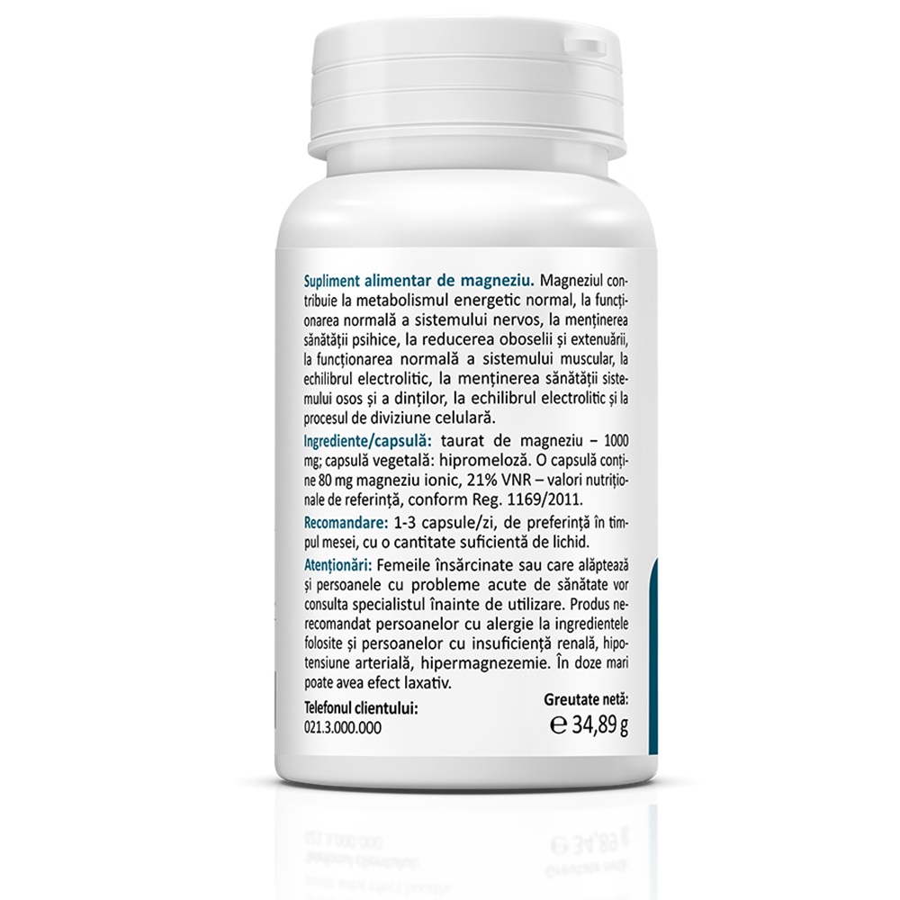 Ingrediente:Taurat de magneziu – 1000 mg (80 mg magneziu ionic); capsulă vegetală: hipromeloză.