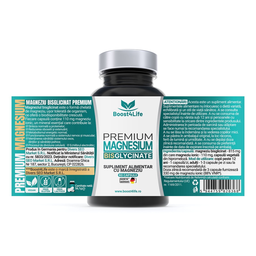 Magneziul Bisglicinat Premium este o forma chelatata de magneziu, usor tolerata de organism si cu biodisponibilitate crescuta. Fiecare capsula contine 110 mg magneziu ionic, un mineral esential care contribuie la reducerea oboselii, functionarea normala a sistemului nervos si muscular, mentinerea sanatatii psihice si osoase.