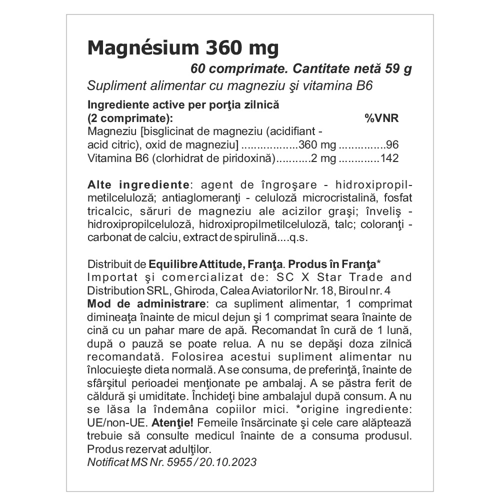 Magneziu [bisglicinat de magneziu (acidifiant - acid citric), oxid de magneziu] 360 mg