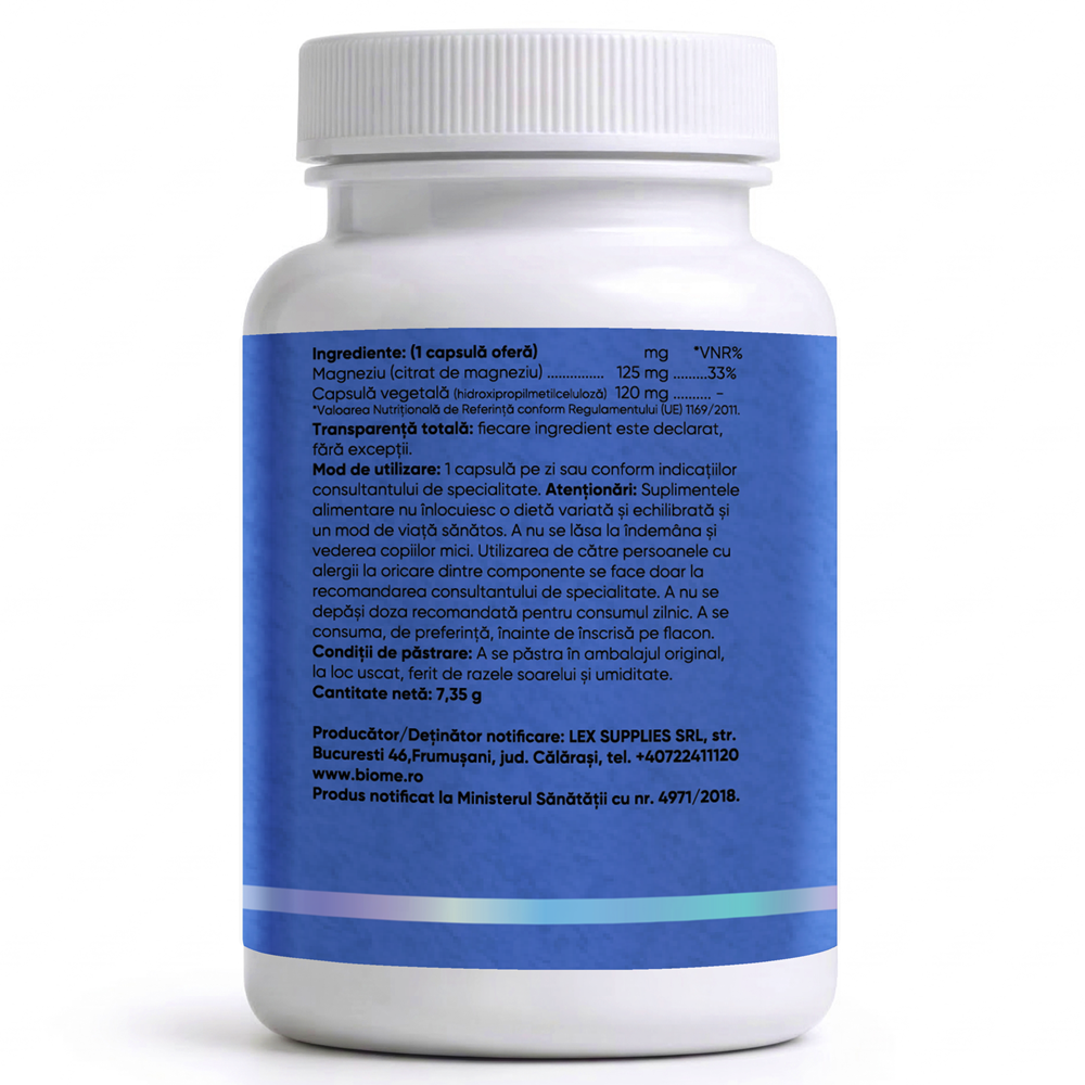 - furnizeaza 125 mg magneziu elementar sub forma de citrat de magneziu, intr-o capsula vegetala;