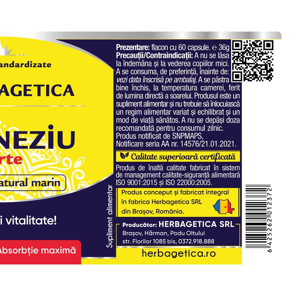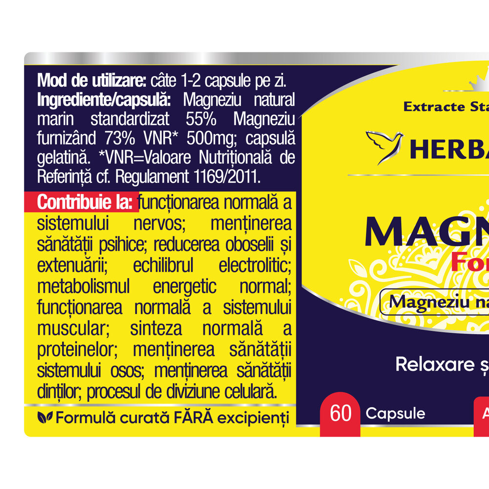 Magneziu natural marin standardizat 55% Magneziu furnizand 73% VNR* 500 mg; capsula: gelatina.