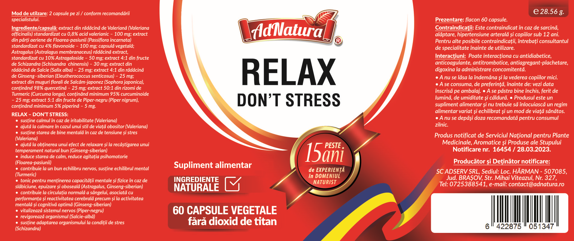 Ingrediente:Per capsulă: extract din rădăcină de Valeriană (Valeriana officinalis) standardizat cu 0,8% acid valerianic - 100 mg; extract din părți aeriene de Floarea-pasiunii (Passiflora incarnata) standardizat cu 4% flavonoide - 100 mg; capsulă vegetală; Astragalus (Astralagus membranaceus) rădăcină extract, standardizat cu 10% Astragaloside - 50 mg; extract 4:1 din fructe de Schizandra (Schisandra chinensis) - 30 mg; extract din rădăcină de Salcie (Salix alba) - 25 mg; extract 4:1 din rădăcină de Ginseng-siberian (Eleutherococcus senticosus) - 25 mg; extract din muguri florali de Salcâm-japonez (Sophora japonica), conținând 98% quercetină - 25 mg; extract 50:1 din rizomi de Turmeric (Curcuma longa), conținând minimum 95% curcuminoide - 25 mg; extract 5:1 din fructe de Piper-negru (Piper nigrum), conținând minimum 5% piperină - 5 mg.