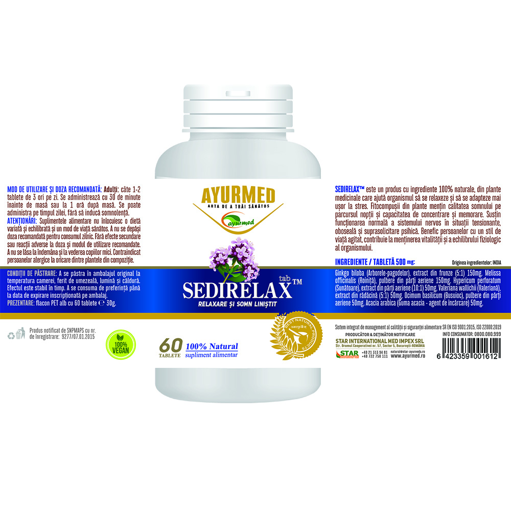 Ginkgo biloba (Arborele-pagodelor), extract din frunze (5:1) 150mg. Melissa officinalis (Roinita), pulbere din parti aeriene 150mg. Hypericum perforatum (Sunatoare), extract din parti aeriene (10:1) 50mg. Valeriana wallichii (Valerianā). extract din radacina (5:1) 50mg. Ocimum basilicum (Busuioc), pulbere din parti aeriene 50mg. Acacia arabica (Guma acacia - agent de incarcare) 50mg.