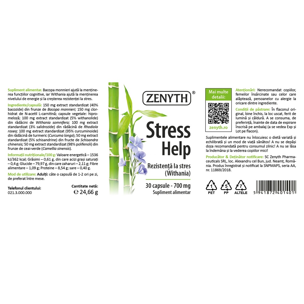 150 mg extract standardizat (40% bacozide) din frunze de Bacopa monnieri, 150 mg clorhidrat de N-acetil L-carnitină, capsule vegetale: hipromeloză, 100 mg extract standardizat (5% withanolide) din rădăcini de Withania somnifera, 100 mg extract standardizat (3% salidrozide) din rădăcină de Rhodiola rosea, 100 mg extract standardizat (95% curcuminoide) din rădăcină de turmeric (Curcuma longa), 50 mg extract standardizat (5% schisandrine) din fructe de Schisandra chinensis, 50 mg extract standardizat (98% polifenoli) din frunze de ceai-verde (Camellia sinensis).