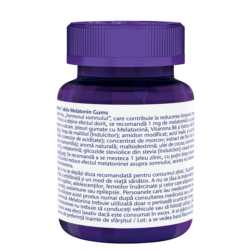 Ingrediente:Sirop De Maltitol, Amidon Modificat, Acid Malic Si Acid Citric, Citrat Trisodic, Concentrat De Morcov, Extract De Flori De Musetel, Aroma Naturala, Maltodextrina, Ulei De Cocos, Clorhidrat De Piridoxina, Melatonina, Glicozide Steviolice Din Stevia, Ceara De Carnauba.