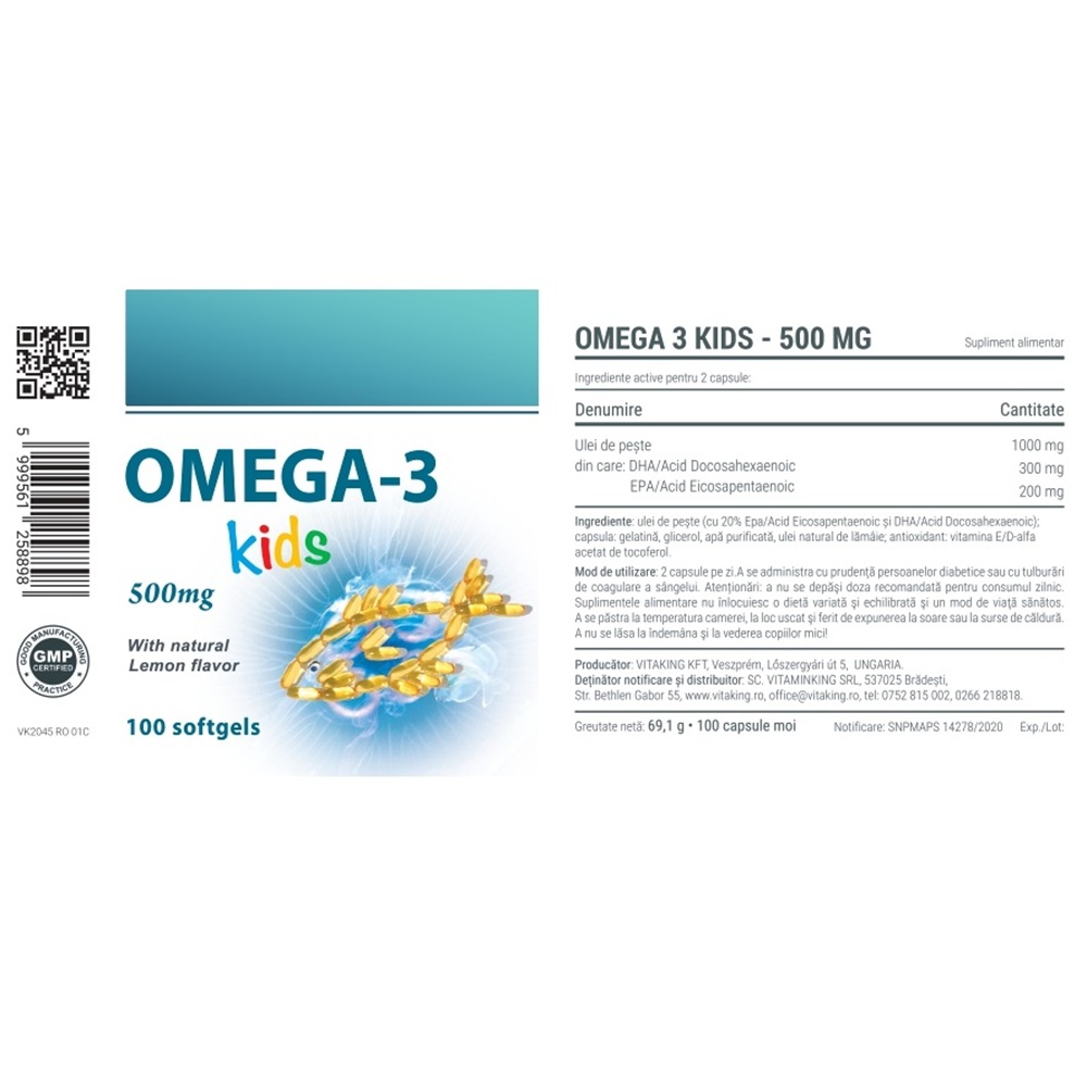Omega 3 natural pentru copii 100 capsule gelatinoase Vitaking(cu aroma de lamaie) face parte din categoria supliment alimentar , contine ingrediente activedha (acid docosahexaenoic), epa ( acid eicosapentaenoic), omega 3.
