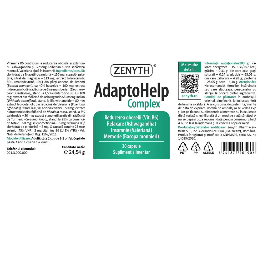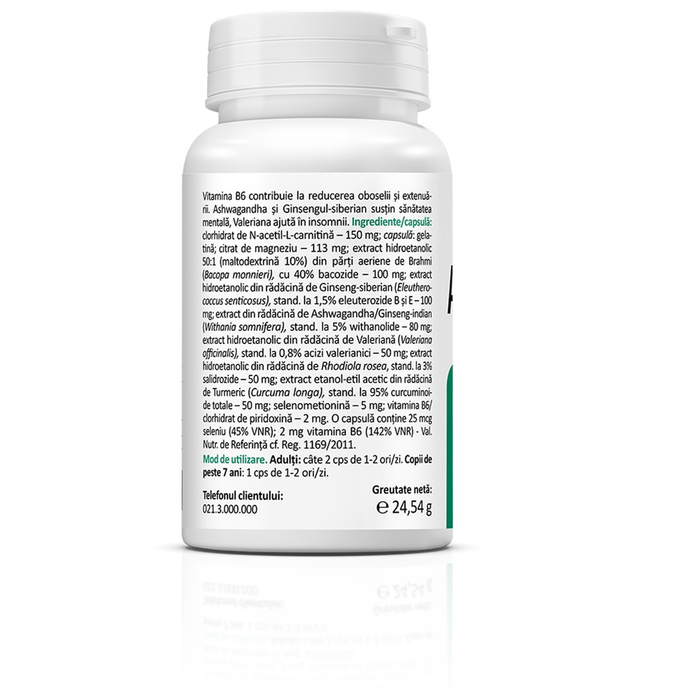 clorhidrat de N-acetil-L-carnitină - 150 mg; capsulă: gelatină; citrat de magneziu - 113 mg; extract hidroetanolic 50:1 (maltodextrină 10%) din părți aeriene de Brahmi (Bacopa monnieri), cu 40% bacozide - 100 mg; extract hidroetanolic din rădăcină de Ginseng-siberian (Eleuthero-coccus senticosus), stand. la 1,5% eleuterozide B și E-100 mg; extract din rădăcină de Ashwagandha/Ginseng-indian (Withania somnifera), stand. la 5% withanolide - 80 mg; extract hidroetanolic din rădăcină de Valeriană (Valeriana officinalis), stand. la 0,8% acizi valerianici - 50 mg; extract hidroetanolic din rădăcină de Rhodiola rosea, stand. la 3% salidrozide - 50 mg; extract etanol-etil acetic din rădăcină de Turmeric (Curcuma longa), stand. la 95% curcuminoi-de totale - 50 mg; selenometionină - 5 mg; vitamina B6/ dorhidrat de piridoxină - 2 mg. O capsulă conține 25 mcg seleniu (45% VNR); 2 mg vitamina B6 (142% VNR) - Val.