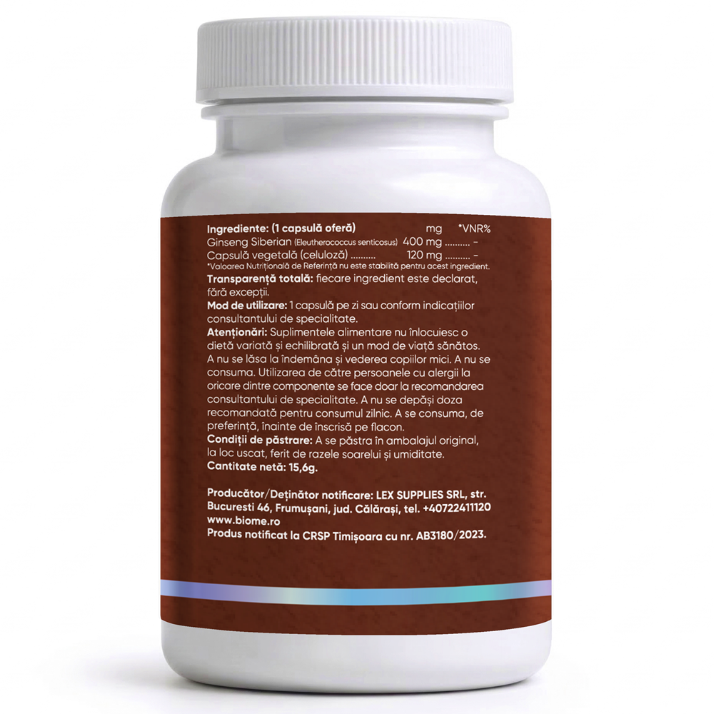 - furnizeaza 400 mg pulbere pura din radacina de Eleutherococcus senticosus, cunoscuta in mod traditional sub denumirea de ginseng siberian;