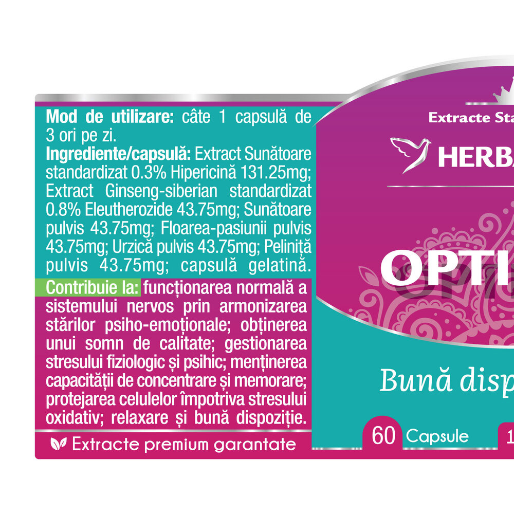 Extract Sunatoare standardizat 0.3% Hipericina 131.25 mg; Extract Ginseng-siberian standardizat 0.8% Eleutherozide 43.75 mg; Sunatoare pulvis 43.75 mg; Floarea-pasiunii pulvis 43.75 mg; Urzica pulvis 43.75 mg; Pelinita pulvis 43.75 mg; capsula: gelatina.