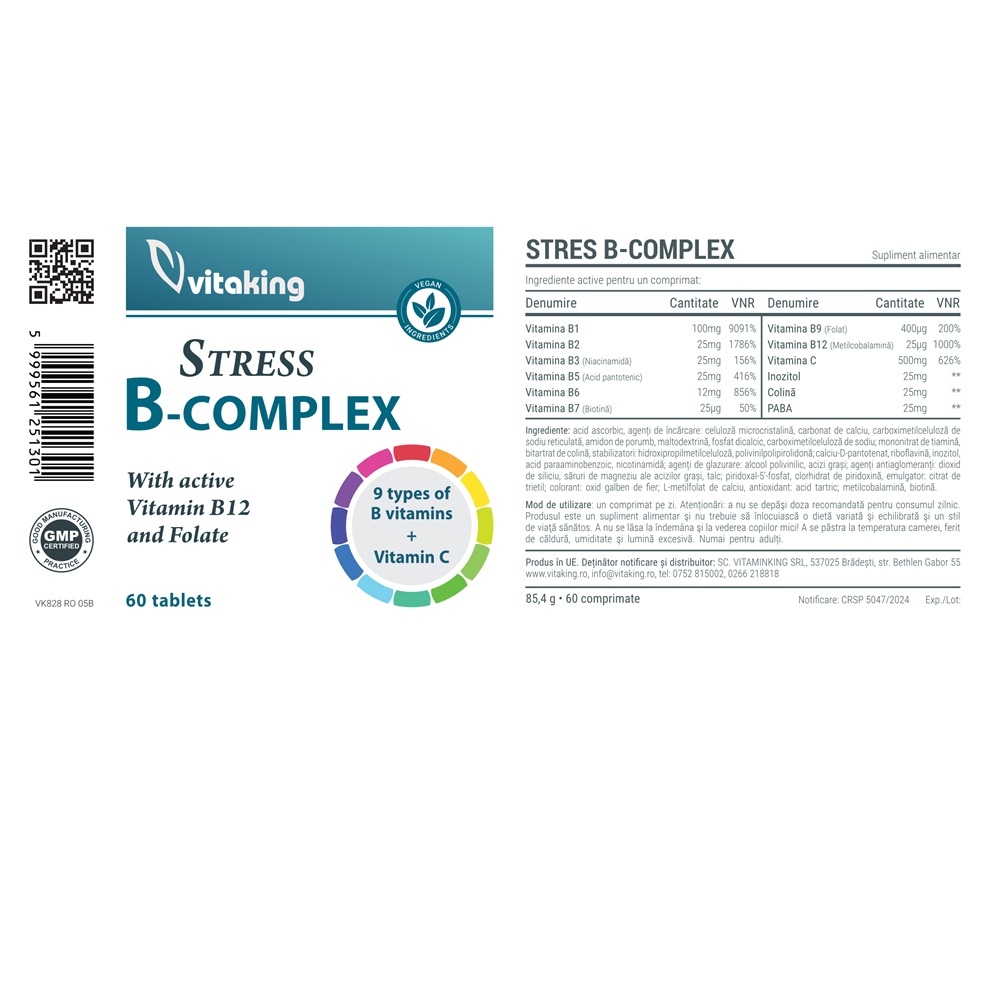 B-complex Stress 60 tablete VitaKing(vitamine B, Inozitol, Vitamina C) face parte din categoria supliment alimentar grupa complex de vitamine b, vitamine , contine ingrediente activeacid folic (folatul), vitamina c (acid ascorbic).
