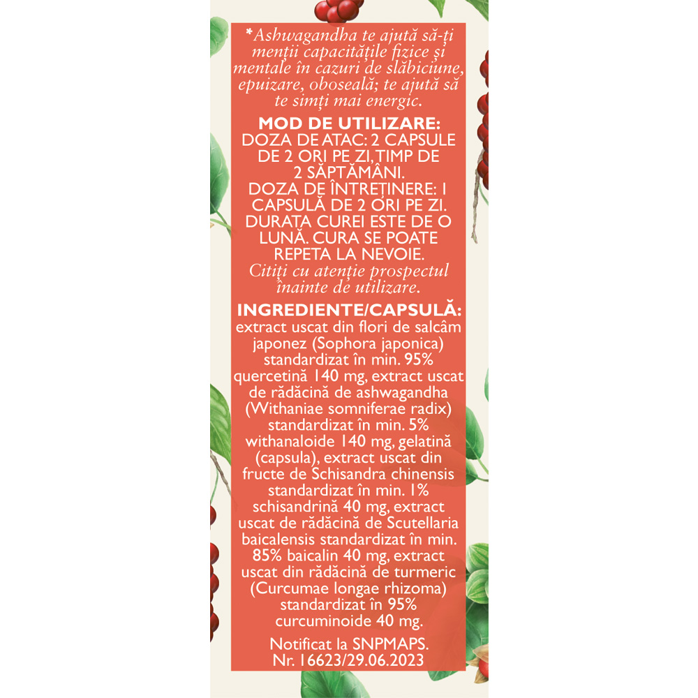 Ingrediente:/Capsula: extract uscat din flori de salcâm japonez (Sophora japonica) standardizat în min. 95% quercetină 140 mg, extract uscat de rădăcină de ashwagandha (Withaniae somniferae radix) standardizat în min. 5% withanaloide 140 mg, gelatină (capsula), extract uscat din fructe de Schisandra chinensis standardizat în min. 1% schisandrină 40 mg, extract uscat de rădăcină de Scutellaria baicalensis standardizat în min. 85% baicalin 40 mg, extract uscat din rădăcină de turmeric (Curcumae longae rhizoma) standardizat în 95% curcuminoide 40 mg.
