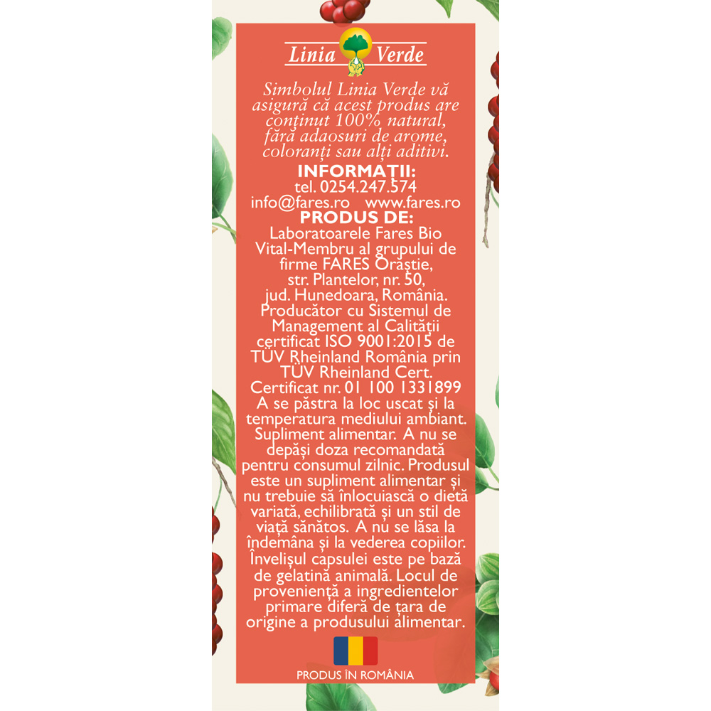Precautii:A se păstra la loc uscat și la temperatura mediului ambiant. Supliment alimentar. A nu se depăși doza recomandată pentru consumul zilnic. Produsul este un supliment alimentar și nu trebuie să înlocuiască o dietă variată, echilibrată și un stil de viaţă sănătos. A nú se lăsa la îndemâna şi la vederea copiilor. Învelişul capsulei este pe bază de gelatină animală. Locul de provenienţă a ingredientelor primare diferă de ţara de origine a produsului alimentar. PRODUS ÎN ROMÂNIA