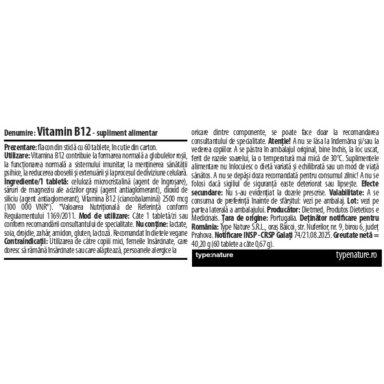- vitamina B12 poate contribui la formarea normala a globulelor rosii, la functionarea normala a sistemului imunitar, la mentinerea sanatatii psihice, la reducerea oboselii si extenuarii si la procesul de diviziune celulara;