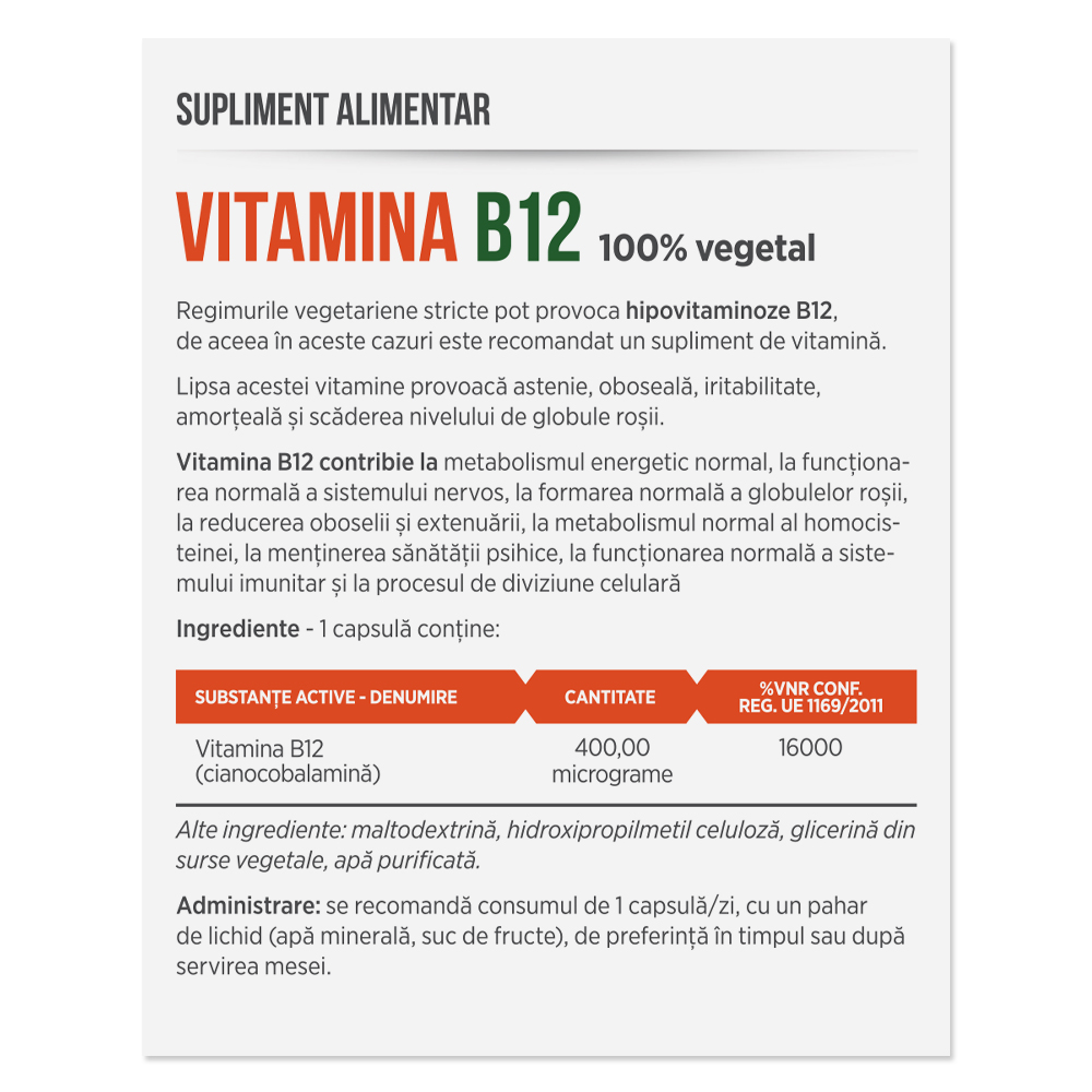 Ingrediente:1 capsula contine: Vitamina B12 (cianocobalamina) 400,00 micrograme Alte ingrediente: maltodextrina, hidroxipropilmetil celuloza, glicerina din surse vegetale, apa purificata.