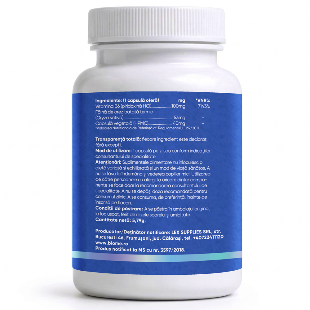 | Vitamina B6 (piridoxină HCl) | 100mg | 7143% |