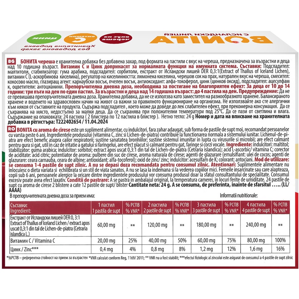 Indulcitori: maltitol; stabilizator: guma arabica; indulcitor: sorbitol; extract apos uscat 0,3:1 din tal de Lichen-de-piatra (Cetraria islandica); acid L-ascorbic/ vitamina C; corector de aciditate: acid citric; pulbere din suc de cirese; potentiator de aroma: aroma naturala de cirese; agenti de glazurare (emulsifiant: ulei de cocos; agenti de glazurare: ceara carnauba, ceara de albine; antioxidant: alfa-tocoferol); oxid de zinc/ zinc; indulcitor: acesulfam de K; colorant: antociani.