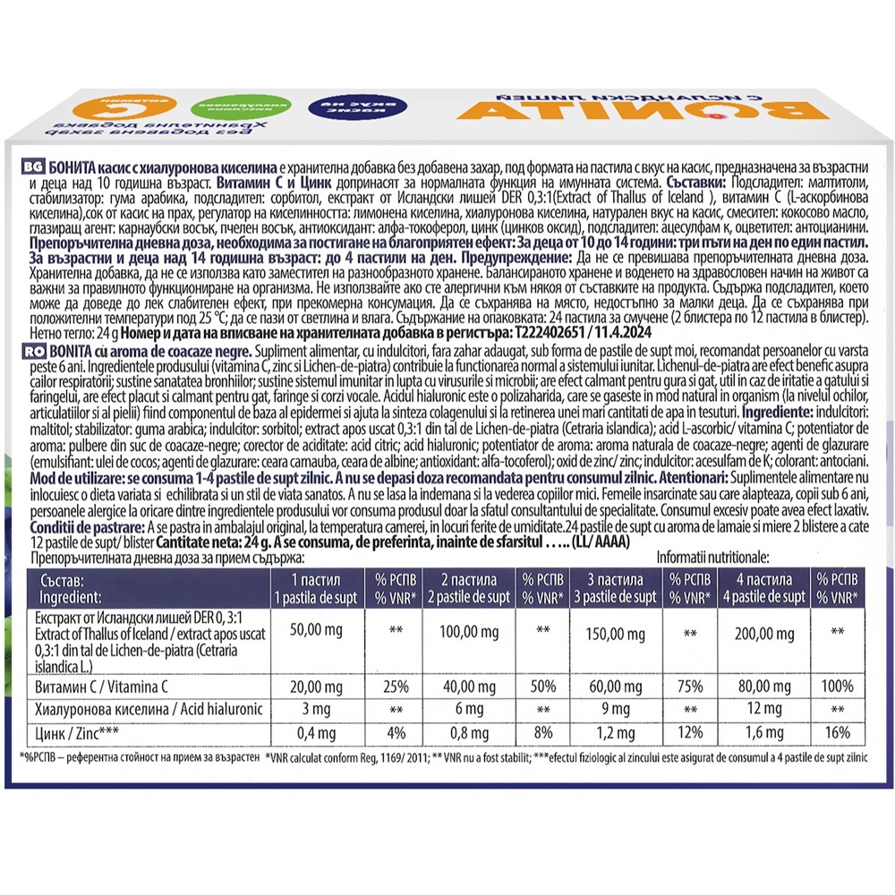 Pastile de supt cu aroma de coacaze negre 24 bucati Bonita(cu lichen islandez, vitamina C si zinc) face parte din categoria supliment alimentar.