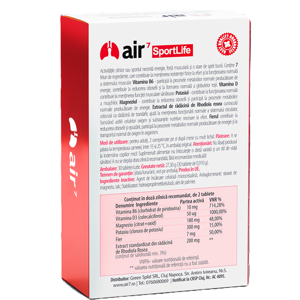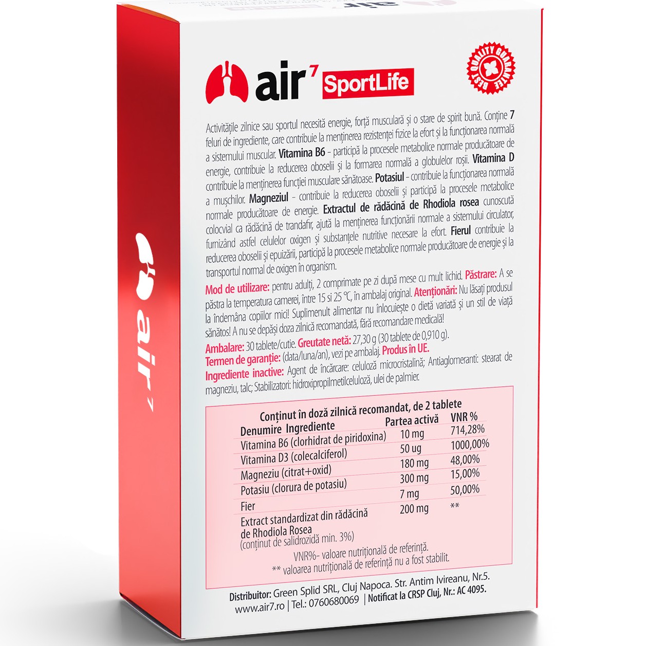 - Air7 SportLife este un supliment alimentar ale cărui ingrediente pot avea un efect benefic asupra organismului in perioadele de efort si este recomandat celor care duc un stil de viață activ, sportiv dar nu numai.