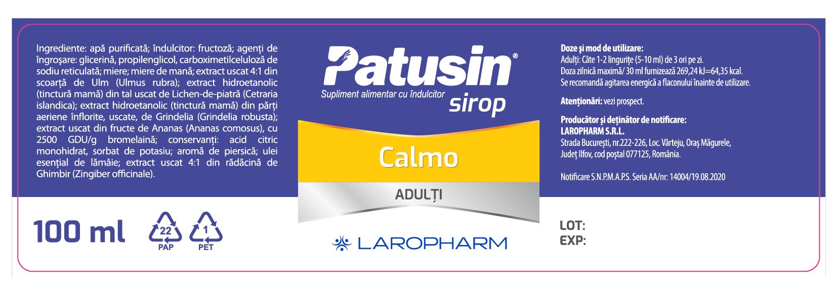 Patusin Calmo sirop pentru adulti, 100 ml, Laropharm [5944756402716]