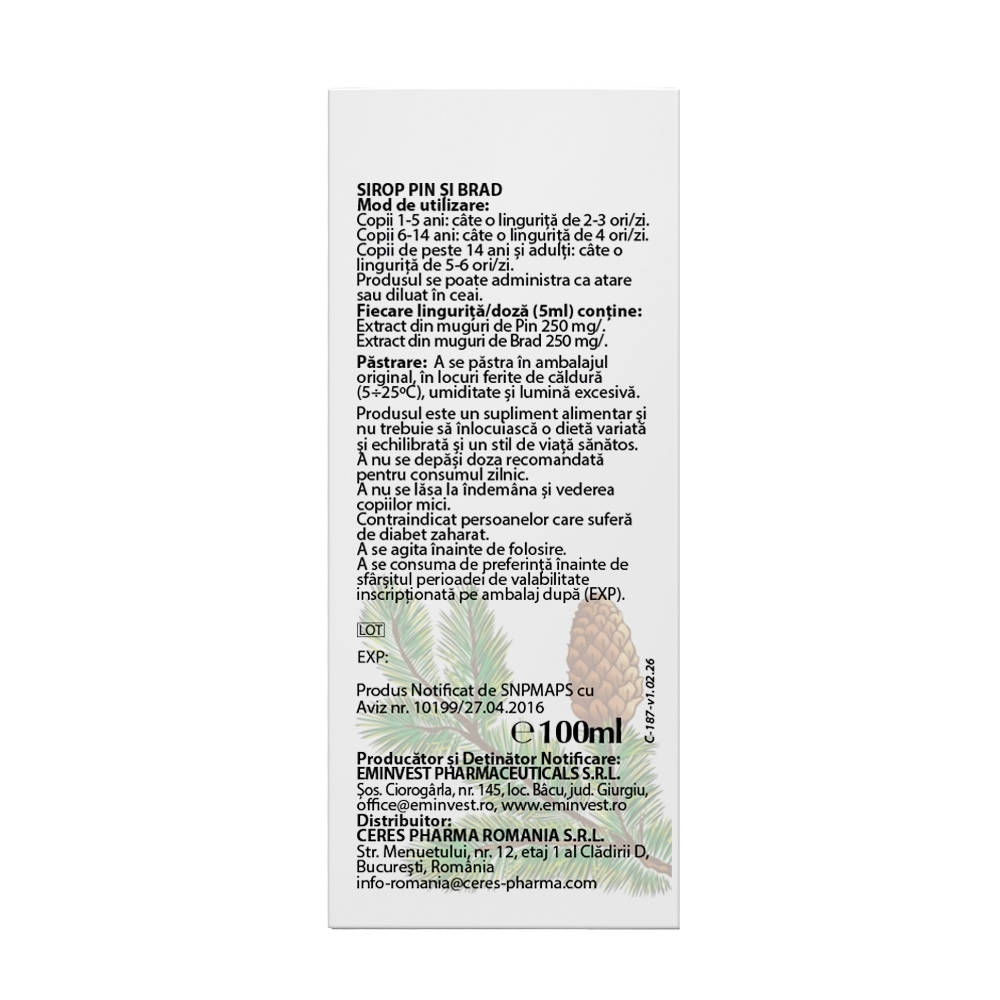 Zahar invertit, apa purificata, extract din muguri de Pin (Pinus sylvestris), extract din muguri de Brad (Abies alba), acidifiant - acid citric monohidrat, aroma de ienupar, conservant - benzoat de sodiu.