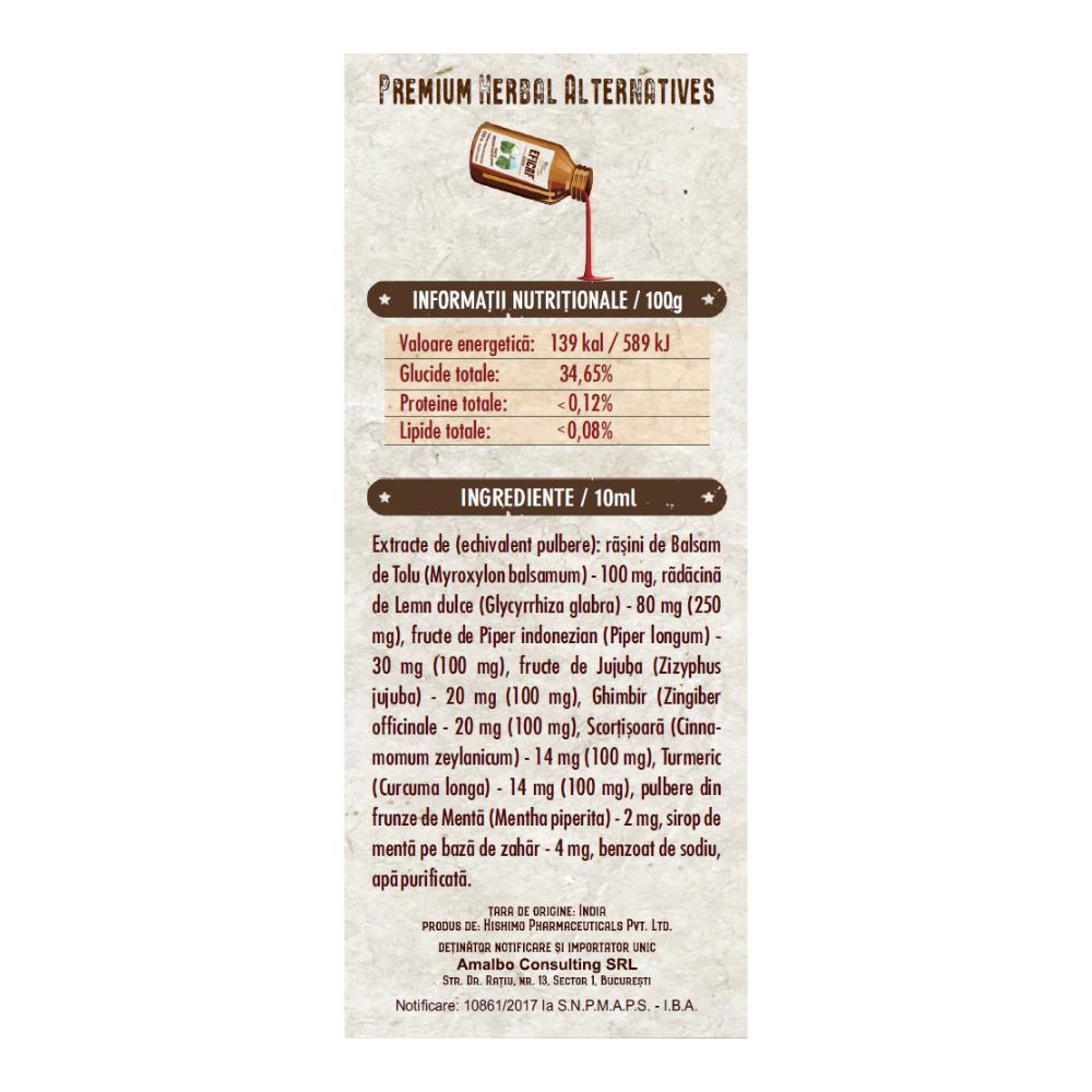 Extracte (echivalent pulbere): rașini de Balsam de Tolu (Myroxylon balsamum) – 100 mg, rădăcină de lemn dulce (Glycyrrhiza glabra) – 80 mg (echivalent 250 mg), fructe de piper indonezian (Piper longum) – 30 mg (echivalent 100 mg), fructe de jujuba (Zizyphus jujuba) – 20 mg (echivalent 100 mg), ghimbir (Zingiber officinale) – 20 mg (echivalent 100 mg), scorțișoară (Cinnamomum zeylanicum) – 14 mg (echivalent 100 mg), turmeric (Curcuma longa) – 14 mg (echivalent 100 mg), pulbere din frunze de mentă (Mentha piperita) – 2 mg, sirop de mentă pe bază de zahăr – 4 mg, benzoat de sodiu, apă purificată.