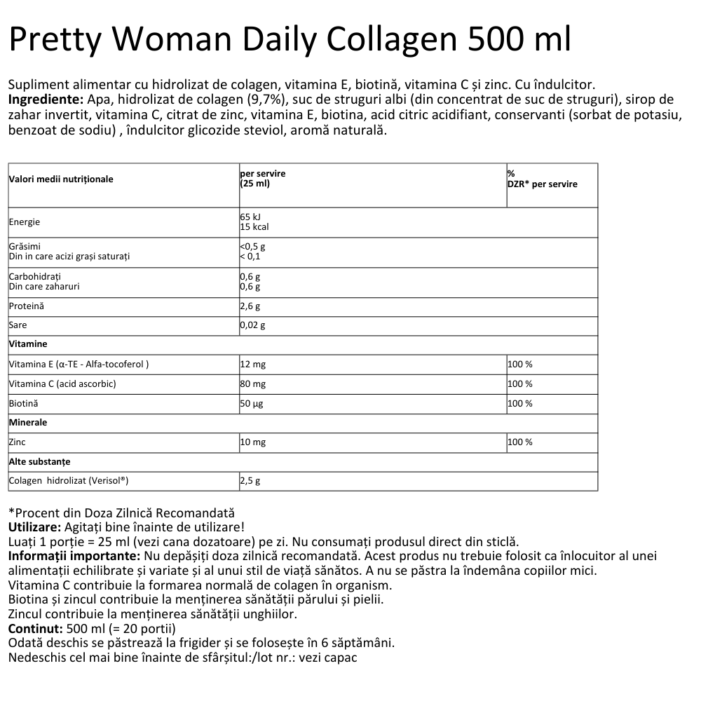 Apa, hidrolizat de colagen (9,7%), suc de struguri albi (din concentrat de suc de struguri), sirop de zahar invertit, vitamina C, citrat de zinc, vitamina E, biotina, acid citric acidifiant, conservanti (sorbat de potasiu, benzoat de sodiu) , indulcitor glicozide steviol, aroma naturala.