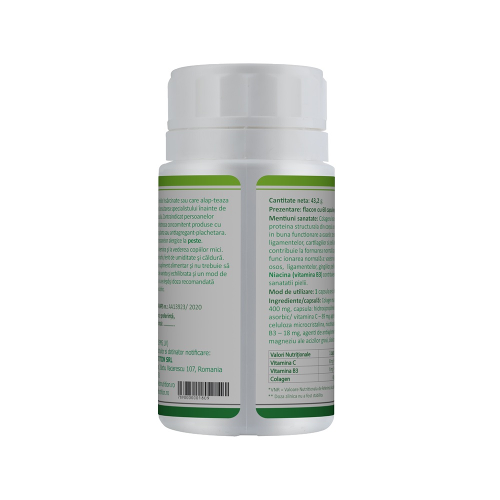 - supliment alimentar cu Colagen marin, vitamina C(acid ascorbic) si vitamina B3 (niacina);