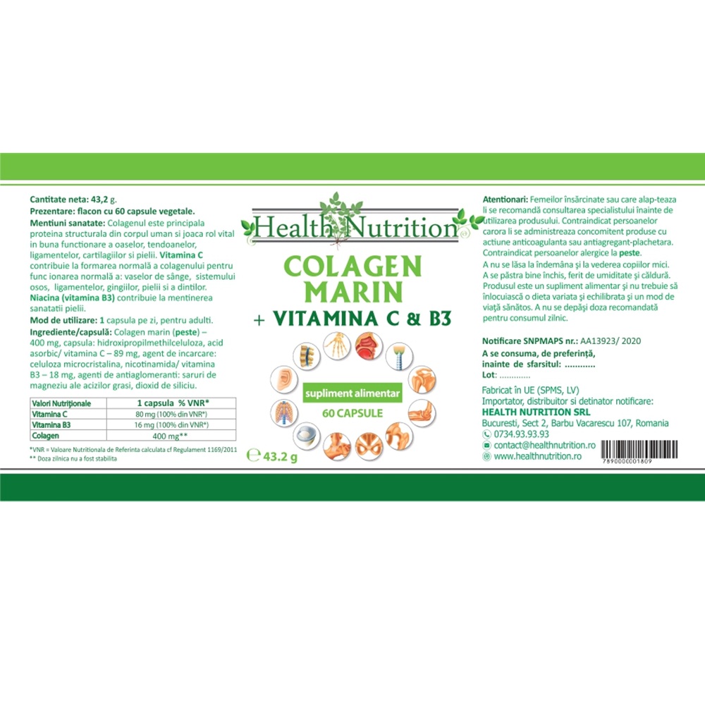 Colagen marin Forte + Vitamina B3 + Vitamina C 60 capsule Health Nutrition(vitamina B3 poate contribui la mentinerea sanatatii pielii) face parte din categoria supliment alimentar stiati ca?stiati ca exista 28 tipuri de colagen care au rol diferit? , contine ingrediente activecolagenul.