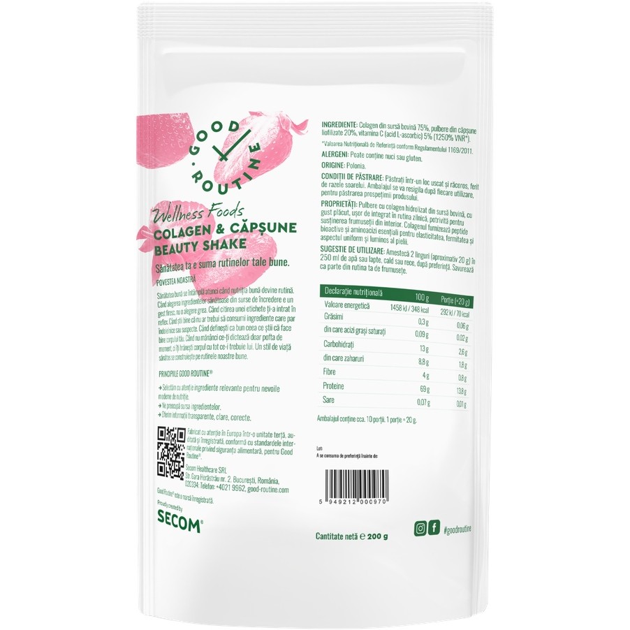 Colagen din sursa bovina 75%, pulbere din capsune liofilizate 20%, vitamina C (acid L-ascorbic) 5% (1250% VNR*).
