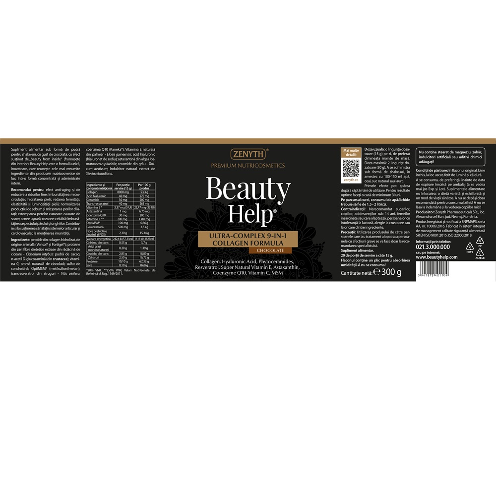 Collagen Formula cu aroma de ciocolata Ultra-Complex 9-in-1 Beauty Help 300 g Zenyth(cu indulcitor natural de Stevia rebaudiana) face parte din categoria supliment alimentar , contine ingrediente activecolagenul.