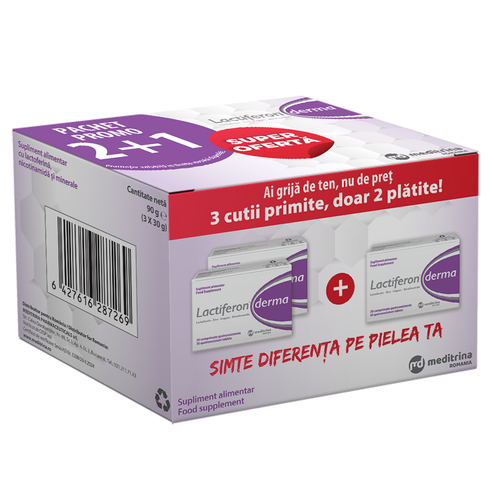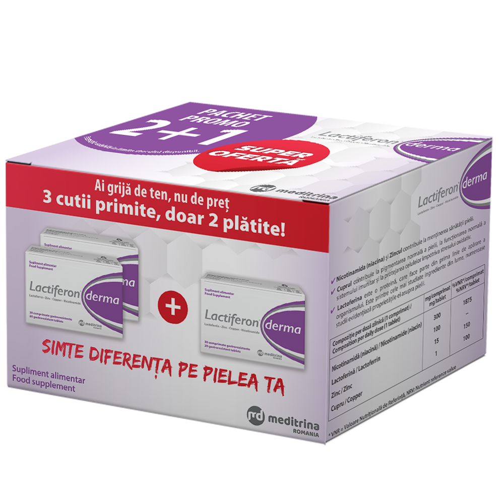 Ingrediente:Fiecare comprimat contine agent de ingrosare: celuloza microcristalina E460i, Nicotinamida/ Vitamina B3 300 mg, Acetat de Lactoferina 117 mg (echivalent cu 100 mg Lactoferina), Gluconat de zinc 118 mg (echivalent cu 15 mg Zinc elementar), agenti de glazurare: selac E904, hidroxipropilmetilceluloza E464, talc E553b si polietilenglicol E1521, agenti antiaglomeranti: saruri de magneziu ale acizilor grasi E470b si dioxid de siliciu E551, Gluconat de cupru 7,14 mg (echivalent cu 1 mg Cupru elementar), coloranti: oxizi si hidroxizi de fier E172, acid carminic E120, indigotina E132.
