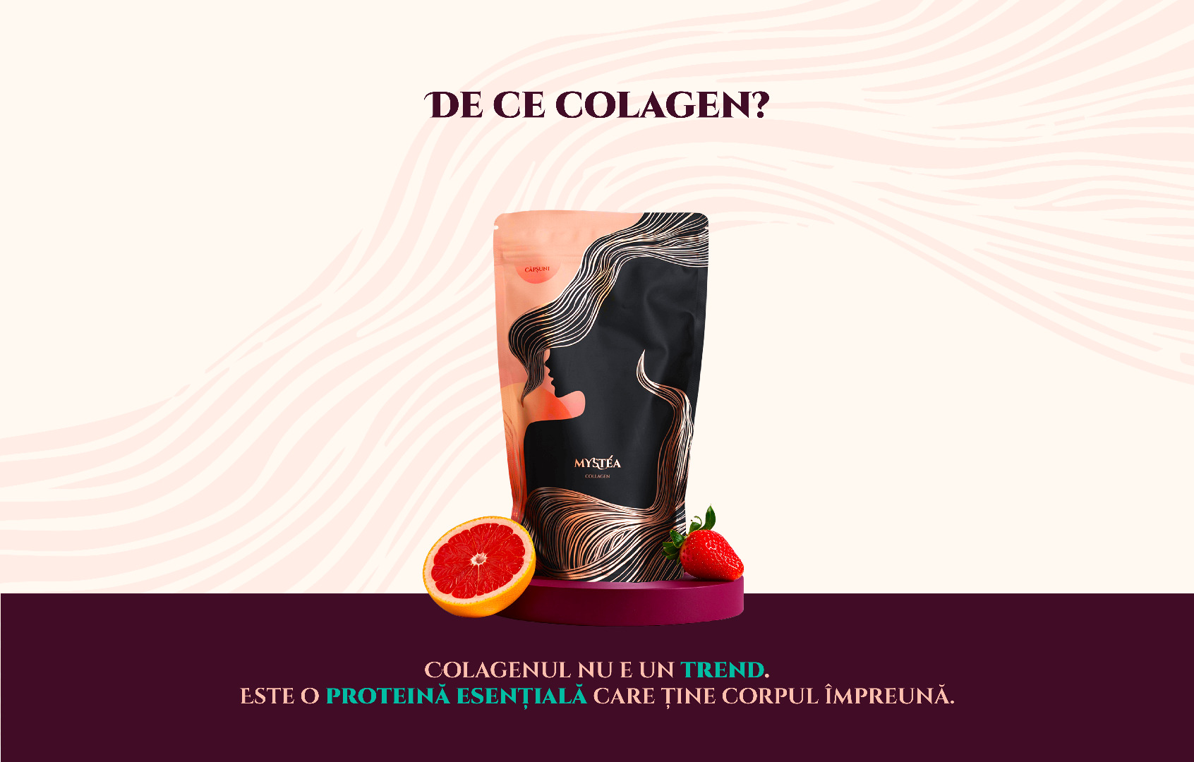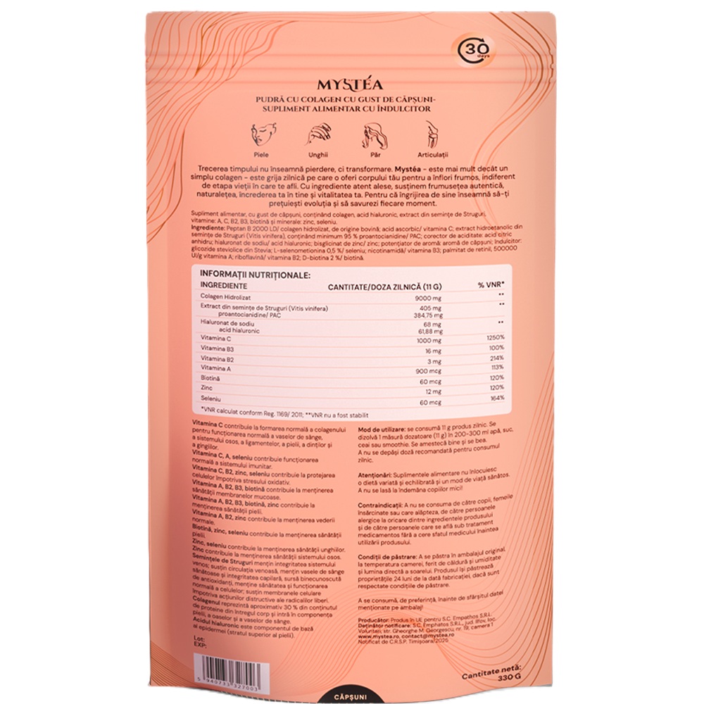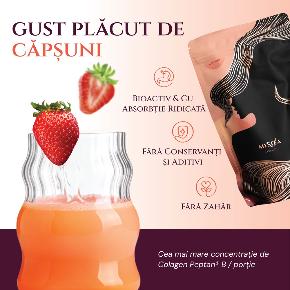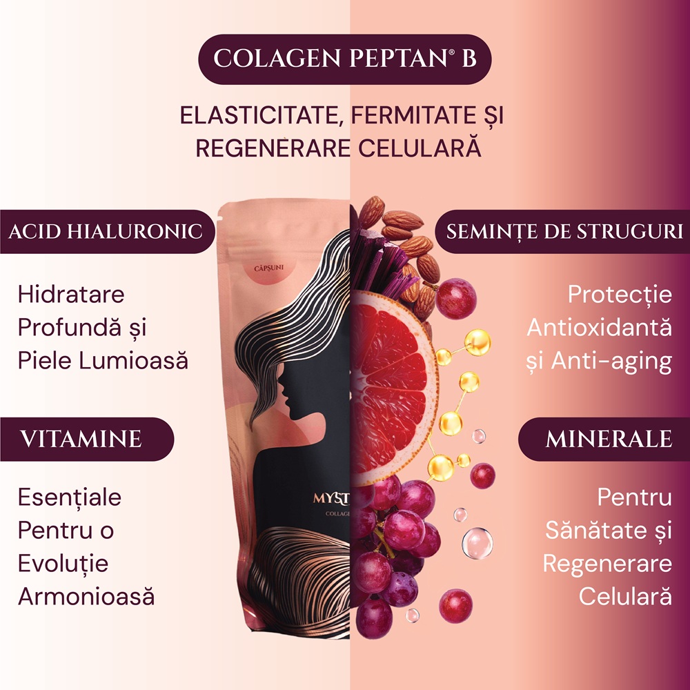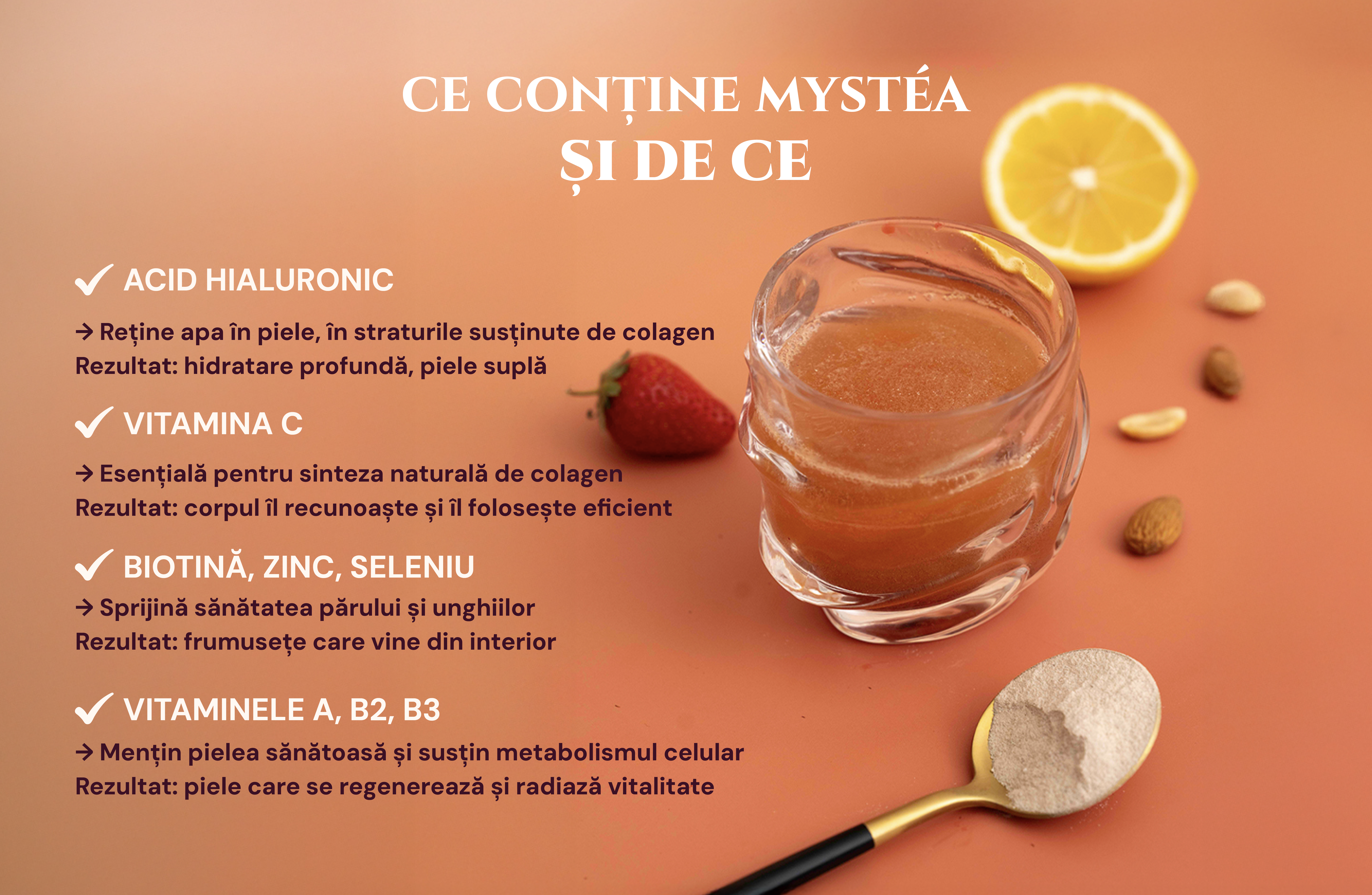 Mystéa folosește Peptan® — un colagen hidrolizat de tip I, cu structură apropiată de cea a colagenului produs natural de corp.