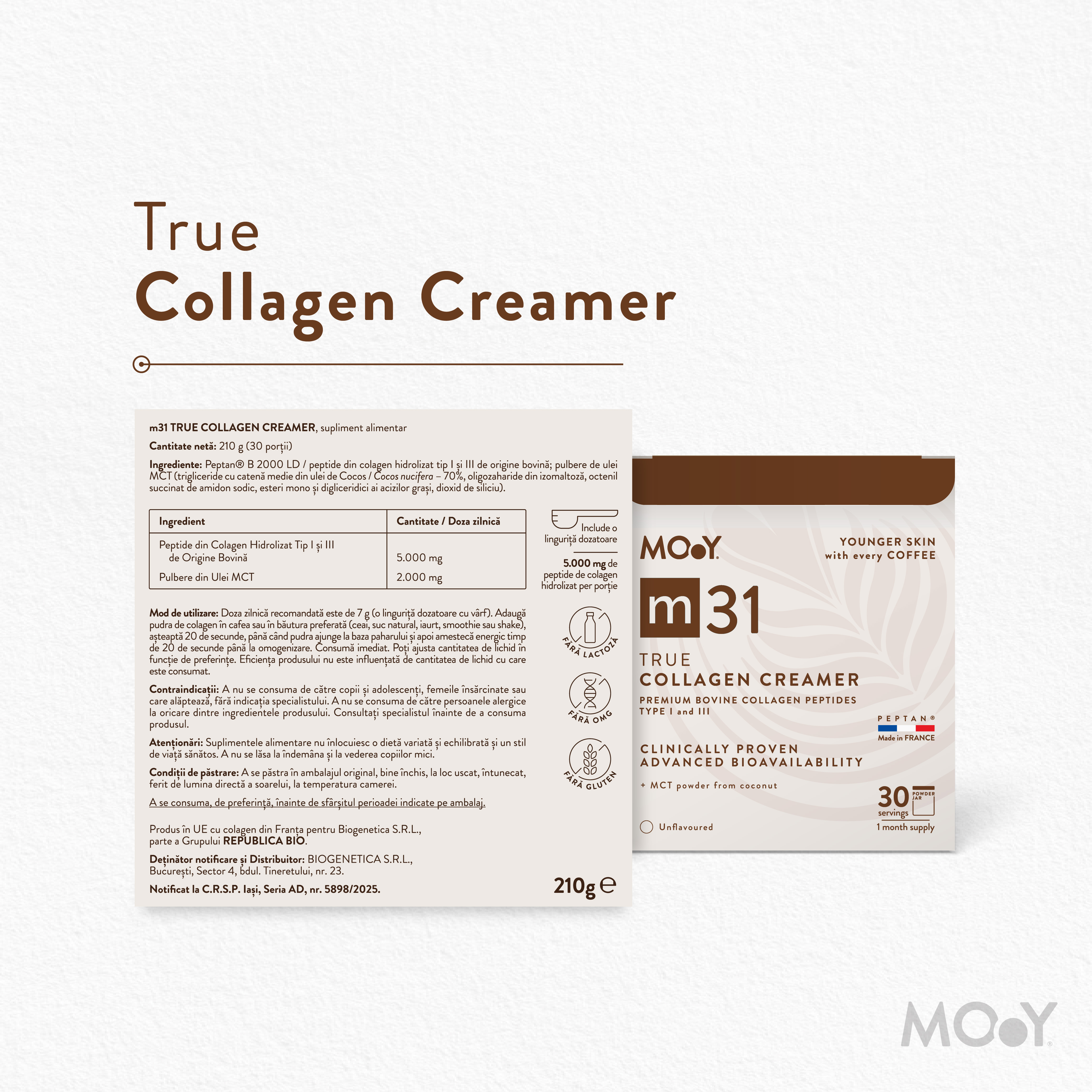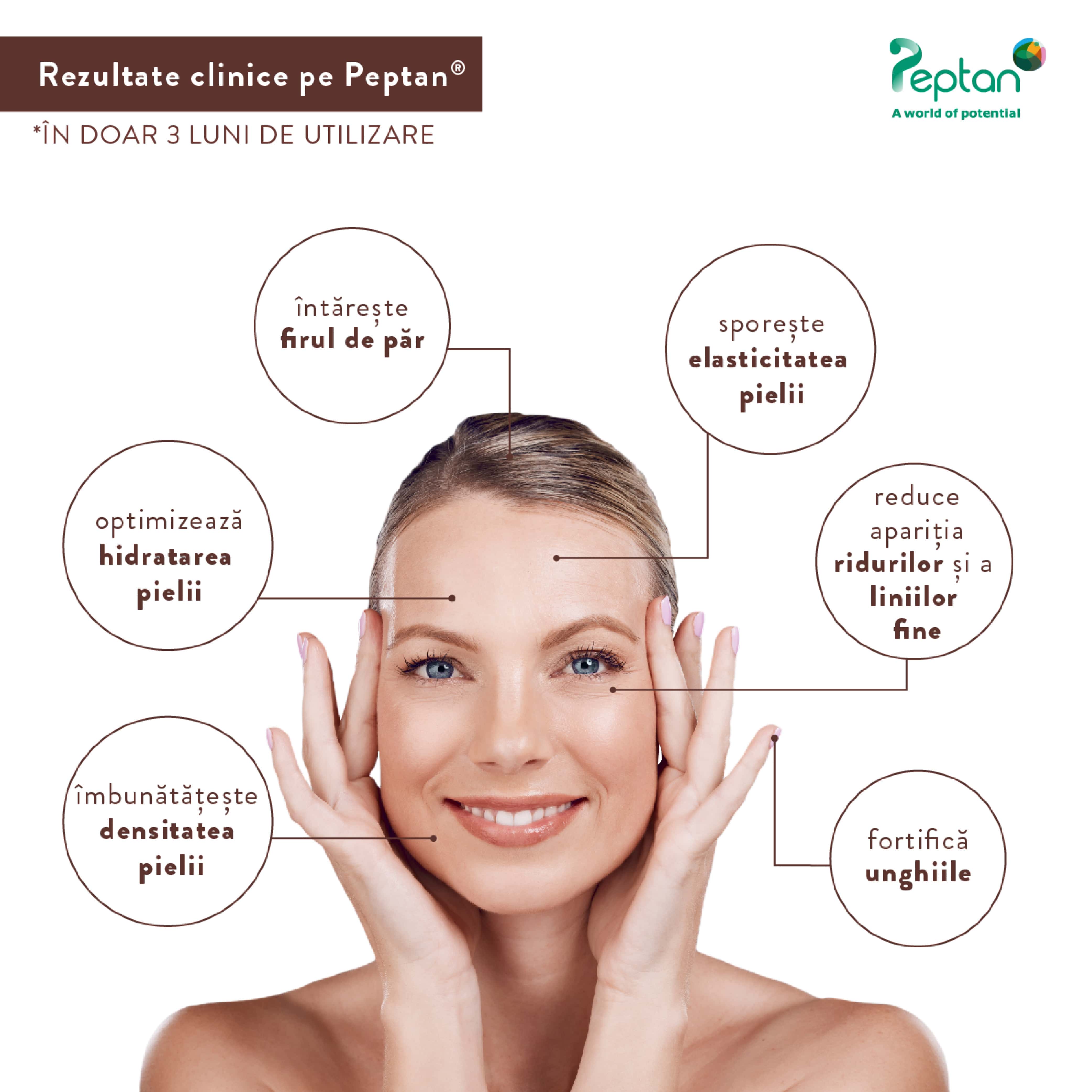 - contine 5.000 mg peptide de colagen hidrolizat Peptan tip I si III de origine bovina, dezvoltate in Franta;
