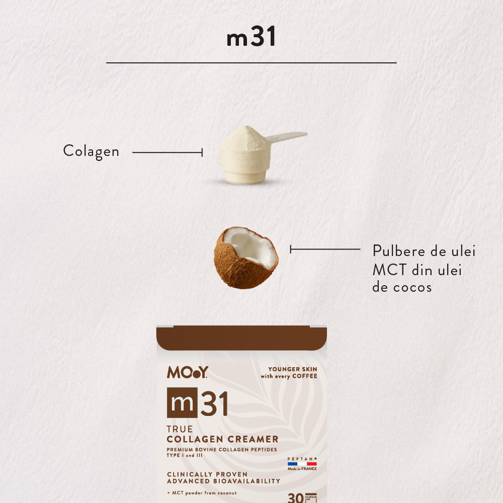 - include pudra de ulei MCT din ulei de cocos, care poate contribui la absorbtia optima a colagenului si ofera o textura cremoasa, perfecta pentru a fi adaugata in cafeaua de dimineata;