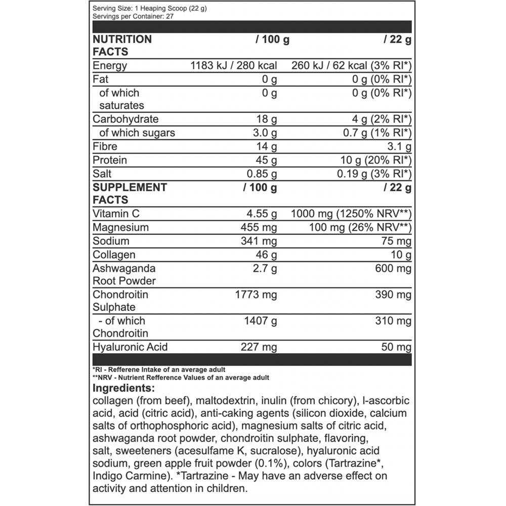 Colagen (din carne de vita), maltodextrina, inulina (din cicoare), acid L-ascorbic, acidifiant (acid citric), agenti antiaglomeranti (dioxid de siliciu, saruri de calciu ale acidului ortofosforic), saruri de magneziu ale acidului citric, pulbere de radacina de ashwagandha (Withania somnifera), sulfat de condroitina, aroma, sare, indulcitori (acesulfam K, sucraloza), acid hialuronic, pulbere de fructe de mar verde (0.1%), coloranti (Tartrazina*, Indigo Carmine).