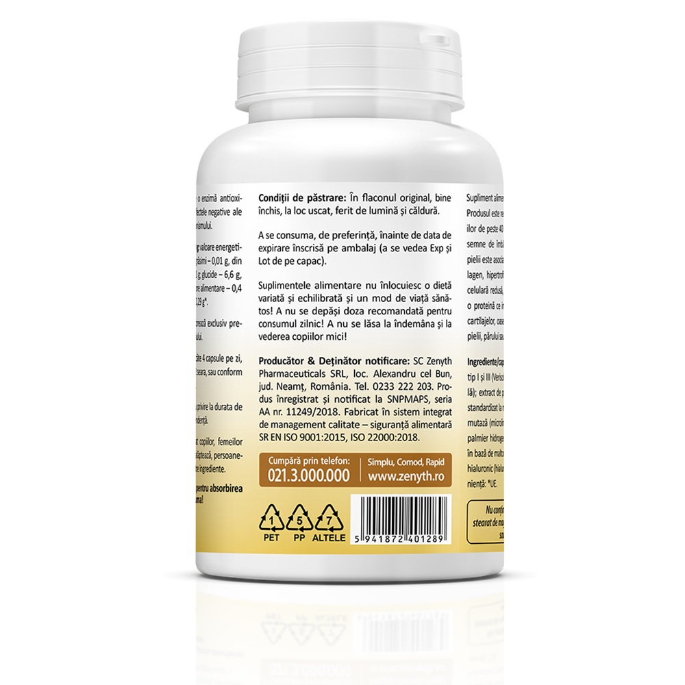colagen bovin hidrolizat tip I și III (Verisol) 636 mg, gelatină (capsulă), extract de pepene-galben (Cucumis melo), standardizat la min. 12.000 Ul/g superoxid dismutază (microîncapsulată cu adaos de ulei de palmier hidrogenat și celuloză microcristalină, în bază de maltodextrină și șelac) 10 mg, acid hialuronic (hialuronat de sodiu) 4 mg.
