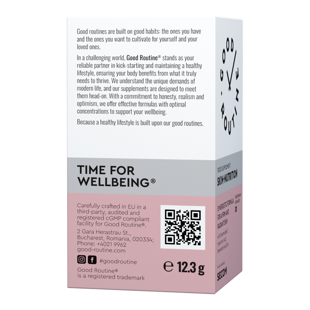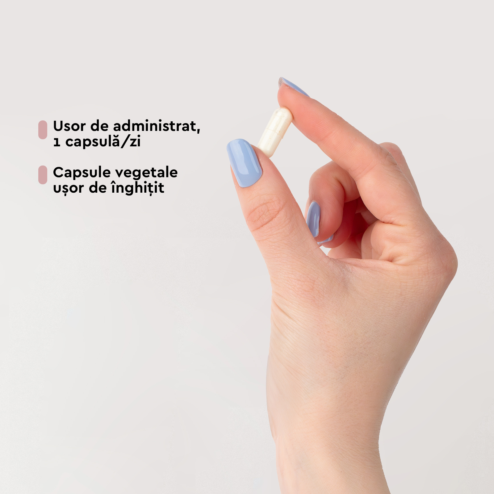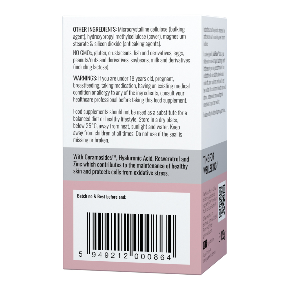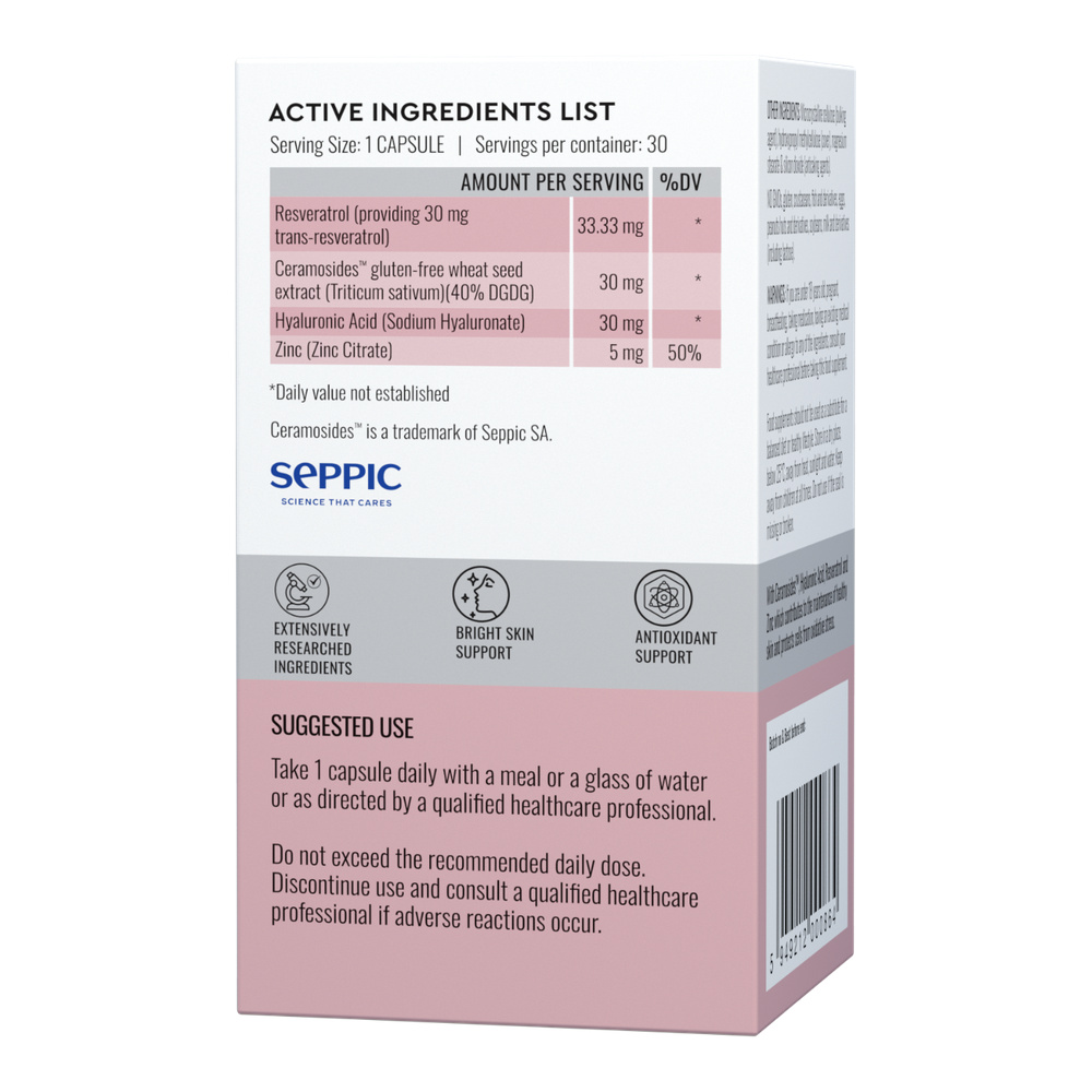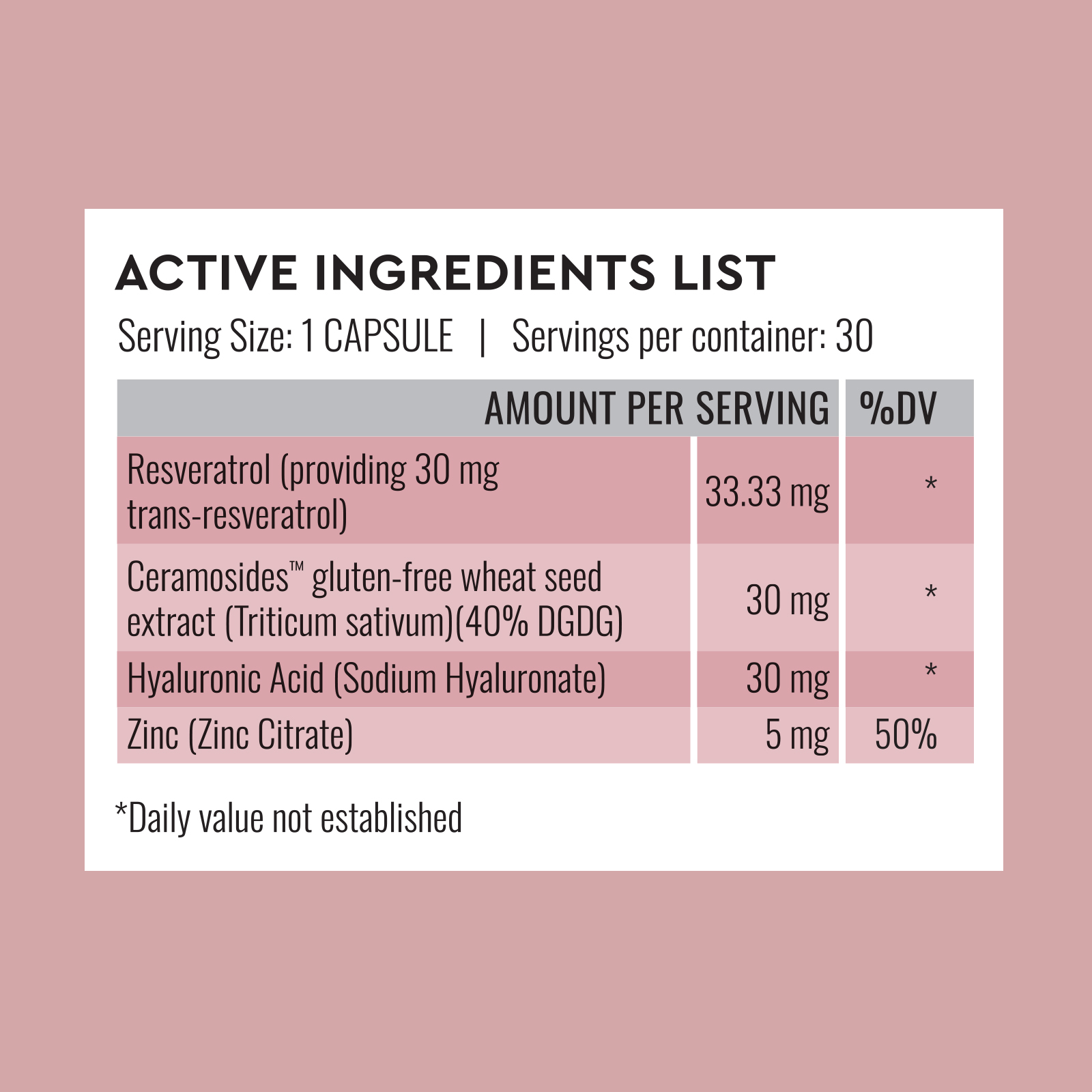 Ingrediente:Per 1 capsula: celuloza microcristalina (agent de incarcare); hidroxipropilmeticeluloza (capsula vegetala); resveratrol (furnizand 30 mg trans-resveratrol) 33.33 mg; acid hialuronic (hialuronat de sodiu) 30mg; Ceramosides™ (complex lipidic patentat de fitoceramide extrase din seminte de grau Triticum sativum/fara gluten, furnizand 40% digalactosil-digliceride (DGDG)) 30mg; zinc (citrat de zinc) 5mg (50% VNR*); stearat de magneziu, dioxid de siliciu (agenti antiaglomeranti).