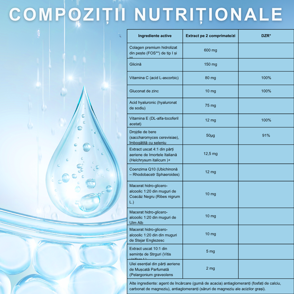 | Colagen premium hidrolizat din pește (FOS**) de tip I și III | 600 mg | / |