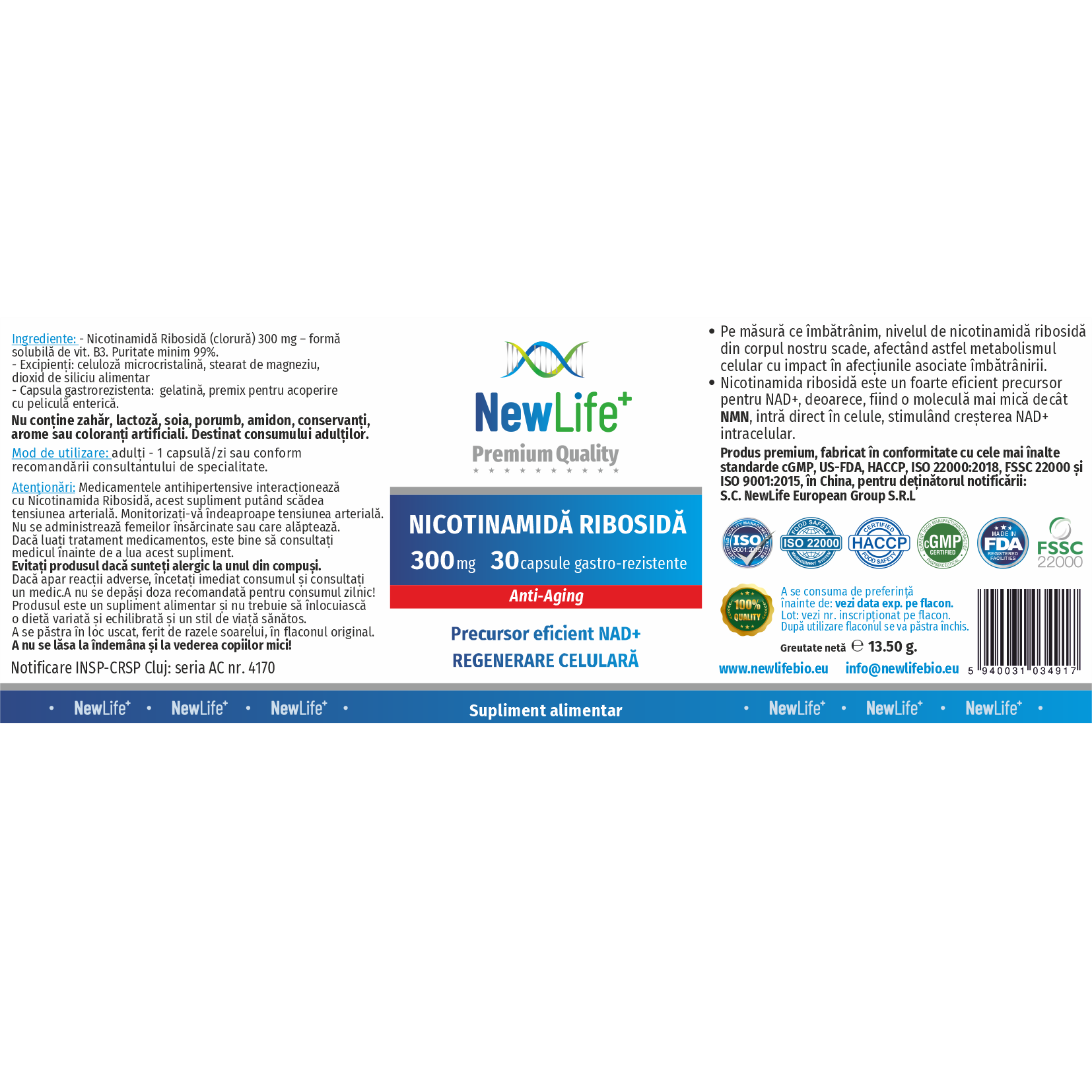 Produs premium cu ingrediente din surse certificate, fabricat în conformitate cu cele mai înalte standarde din industria farmaceutică și pentru siguranță alimentară: cGMP, US-FDA, HACCP, ISO 22000:2018, FSSC 22000 și ISO 9001:2015.