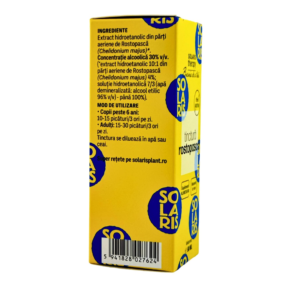 Extract hidroetanolic din parti aeriene de Rostopasca (Chelidonium majus)*. Concentratie alcoolica 30% v/v. (*extract hidroetanolic 10:1 din parti aeriene de Rostopasca (Chelidonium majus) 4%; solutie hidroetanolica 7/3 (apa demineralizata:alcool etilic 96% v/v) – pana 100%).