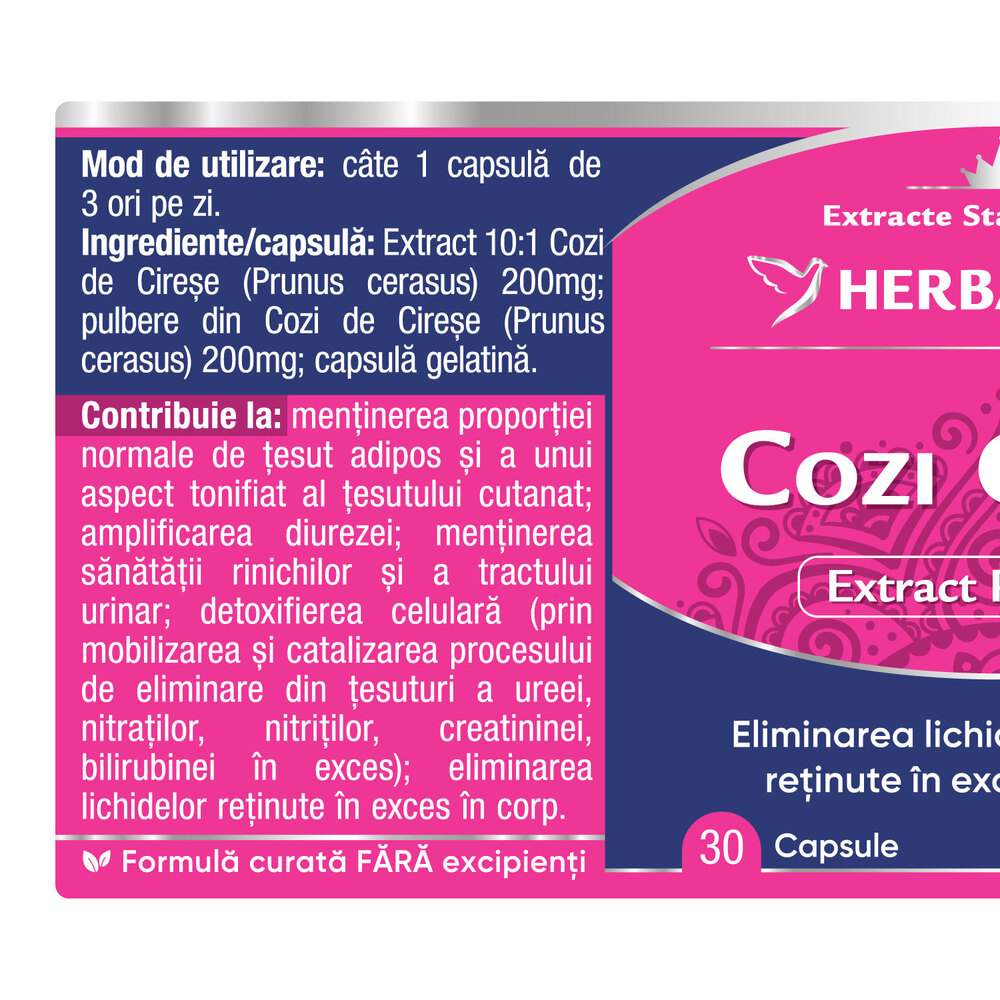 Extract 10:1 Cozi de Cirese (Prunus cerasus) 200 mg; pulbere din Cozi de Cirese (Prunus cerasus) 200 mg; capsula: gelatina.